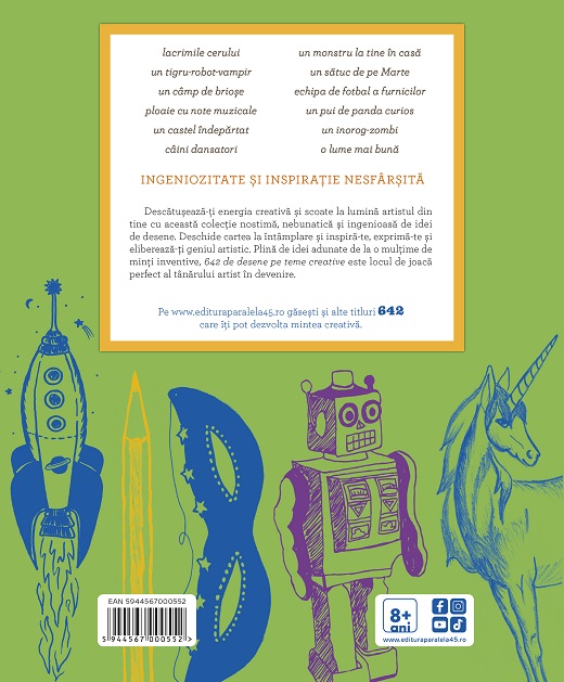Deschide cartea la întâmplare și inspiră-te, exprimă-te și eliberează-ţi geniul artistic. Plină de idei adunate de la o mulţime de minţi inventive, 642 de desene pe teme creative este locul de joacă perfect al tânărului artist în devenire.