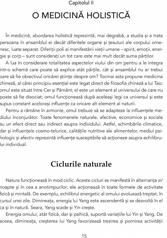 Efectele acupuncturii, ale fitoterapiei chineze sau ale exercitiilor Qi Gong sunt astazi unanim recunoscute. Dar legile si conceptele medicinei chineze raman vagi pentru mintile noastre occidentale. Totusi, departe de a se opune tezelor stiintifice moderne, energetica chineza se bazeaza pe un model holistic si universal de intelegere a lumii vii.