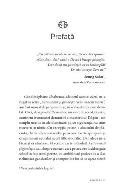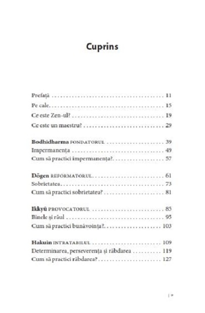 În această carte, François Busson creionează portretul a șase maeștri, fiecare întruchipând o valoare fundamentală a buddhismului Zen. Aceste personaje, adesea pitoreşti, sunt foarte departe de imaginea pe care o avem despre Înțeleptul cu Î mare. Așadar, urmaţi calea Zen-ului în compania lui Bodhidharma, barbarul cu ochi senini, a lui Dōgen, reformatorul erudit, a lui Ikkyū, iubitorul de femei și de sake, a lui Hakuin, samuraiul Zen, a lui Ryōkan, călugărul prieten al copiilor, precum și a lui Kōdō Sawaki, spiritul liber.