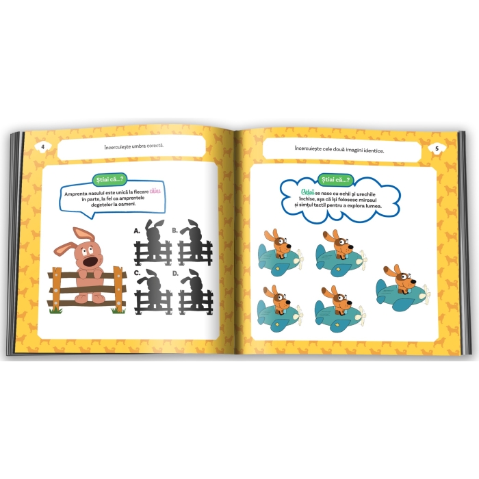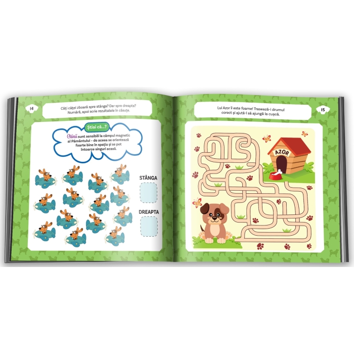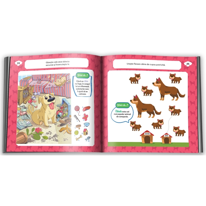 Știai că câinii pot înțelege până la 250 de cuvinte și gesturi de-ale noastre și că ne sunt alături de aproximativ 15.000 de ani? „Activități și curiozități despre câini” conține informații interesante și activități precum: