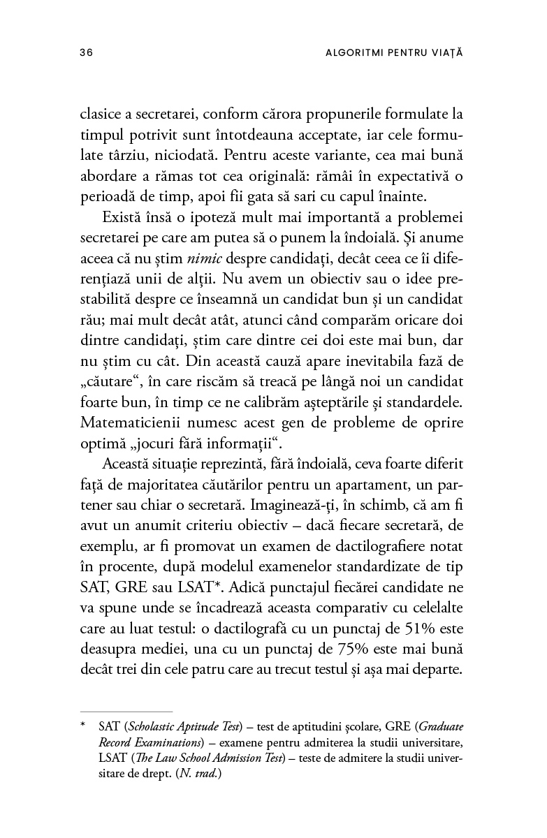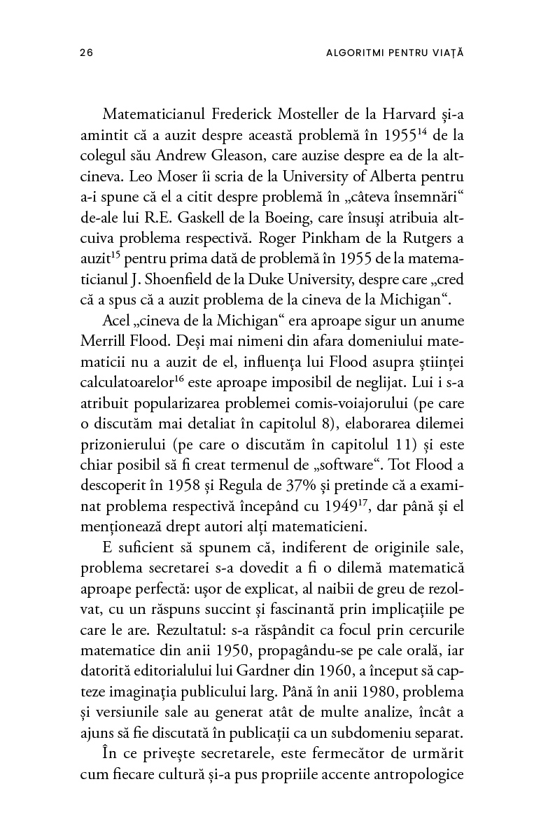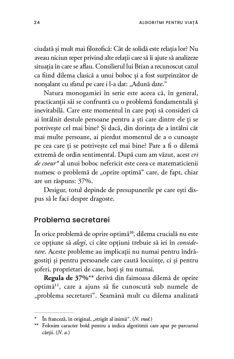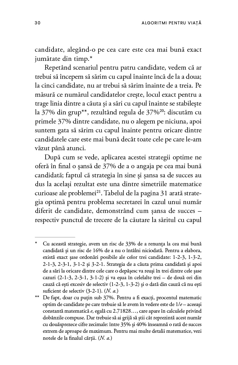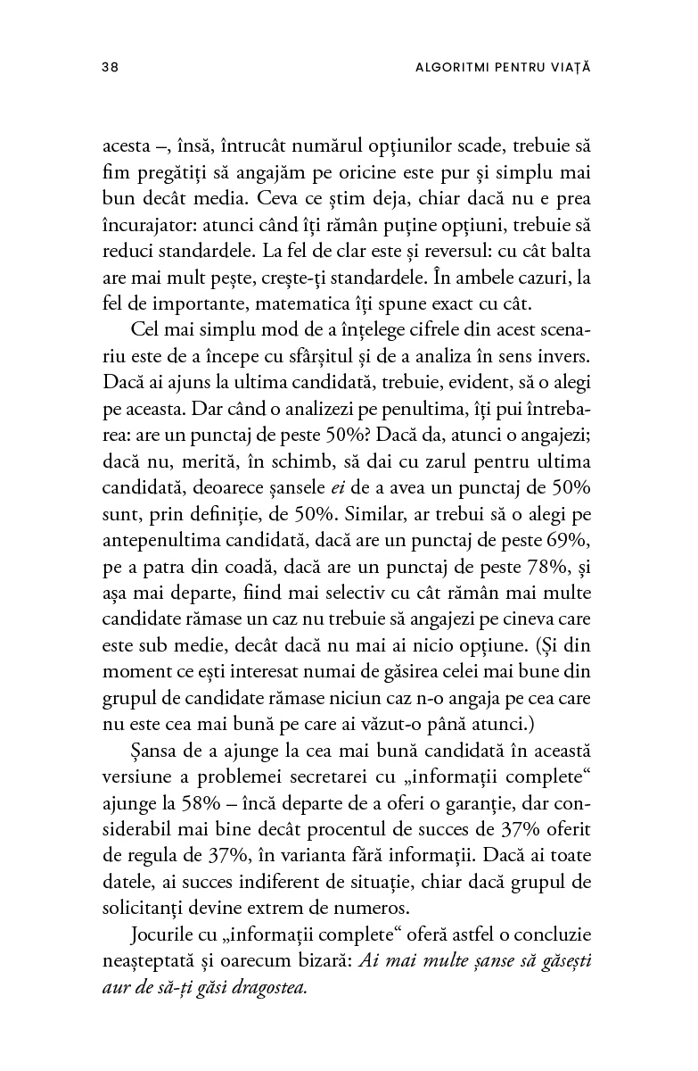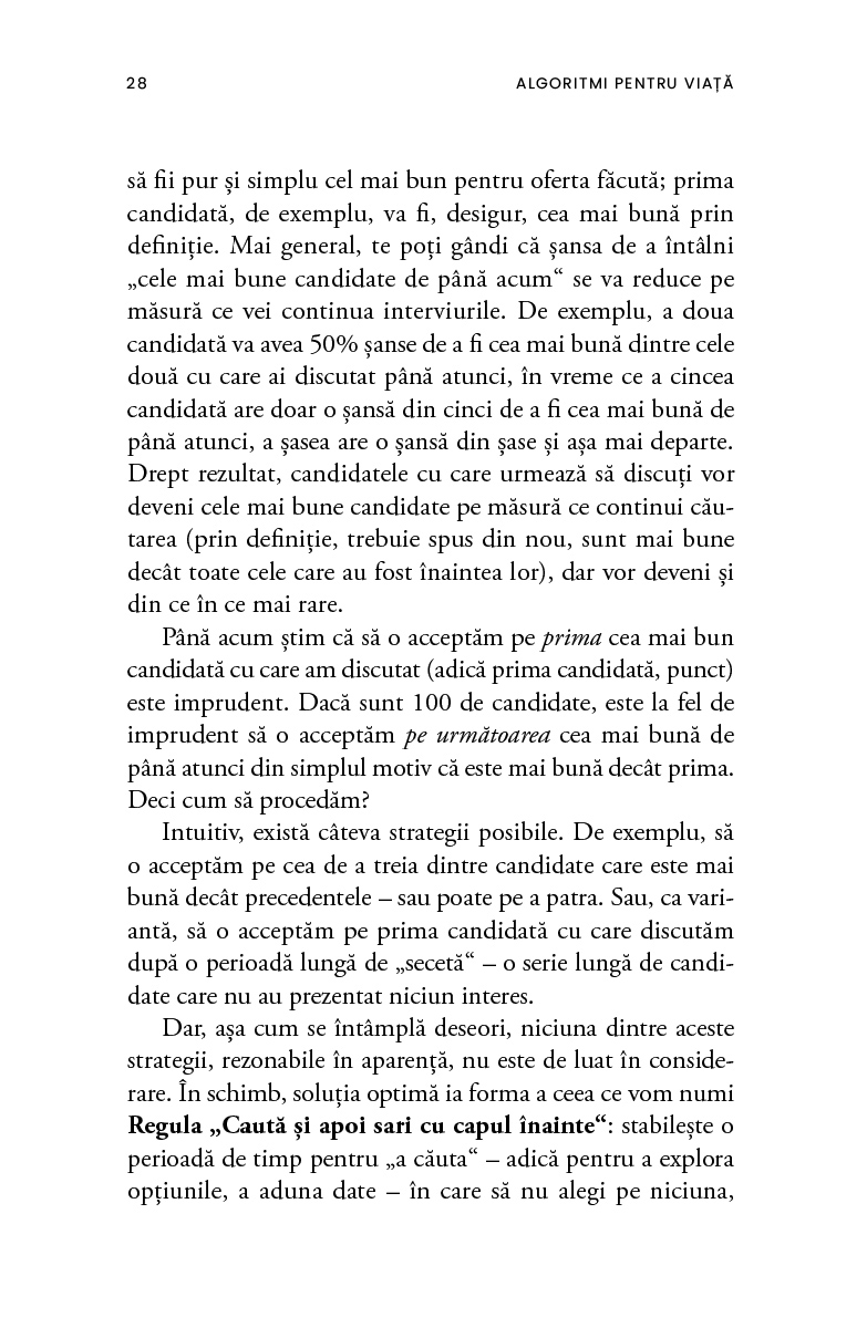 Ideile din această carte sunt gata să-ți perfecționeze modul în care abordezi probleme dintre cele mai diverse. De la căutarea unui loc de parcare sau a unui apartament până la alegerea partenerului ideal, multe situații pot fi analizate utilizând algoritmi. Cum îți poți face ordine în bibliotecă, în Inbox sau în dulap și când e bine să nu exagerezi cu aranjatul, ca să nu pierzi timpul? Când să te încrezi în intuiție și când să lași lucrurile la voia întâmplării? Unde se află echilibrul între activitățile obișnuite și cele noi? Autorii îți vor răspunde la aceste întrebări și la multe altele și îți vor demonstra că locul algoritmilor nu este doar în manualele școlare.