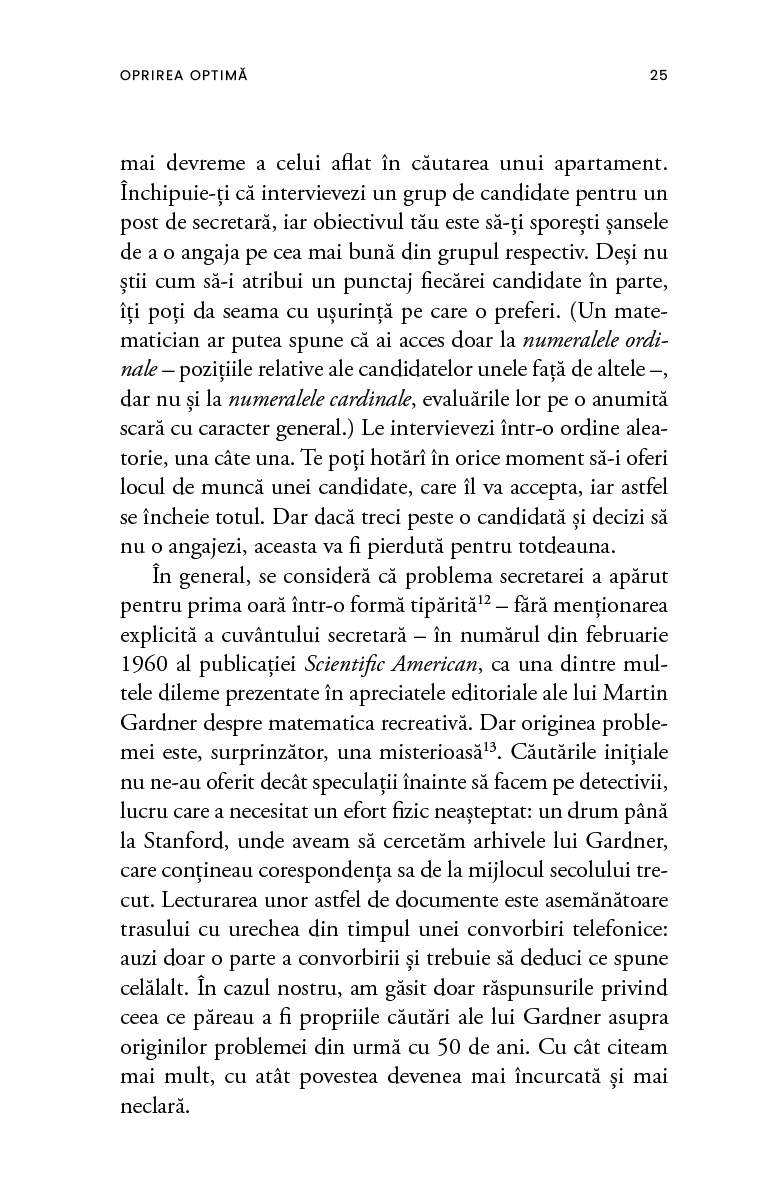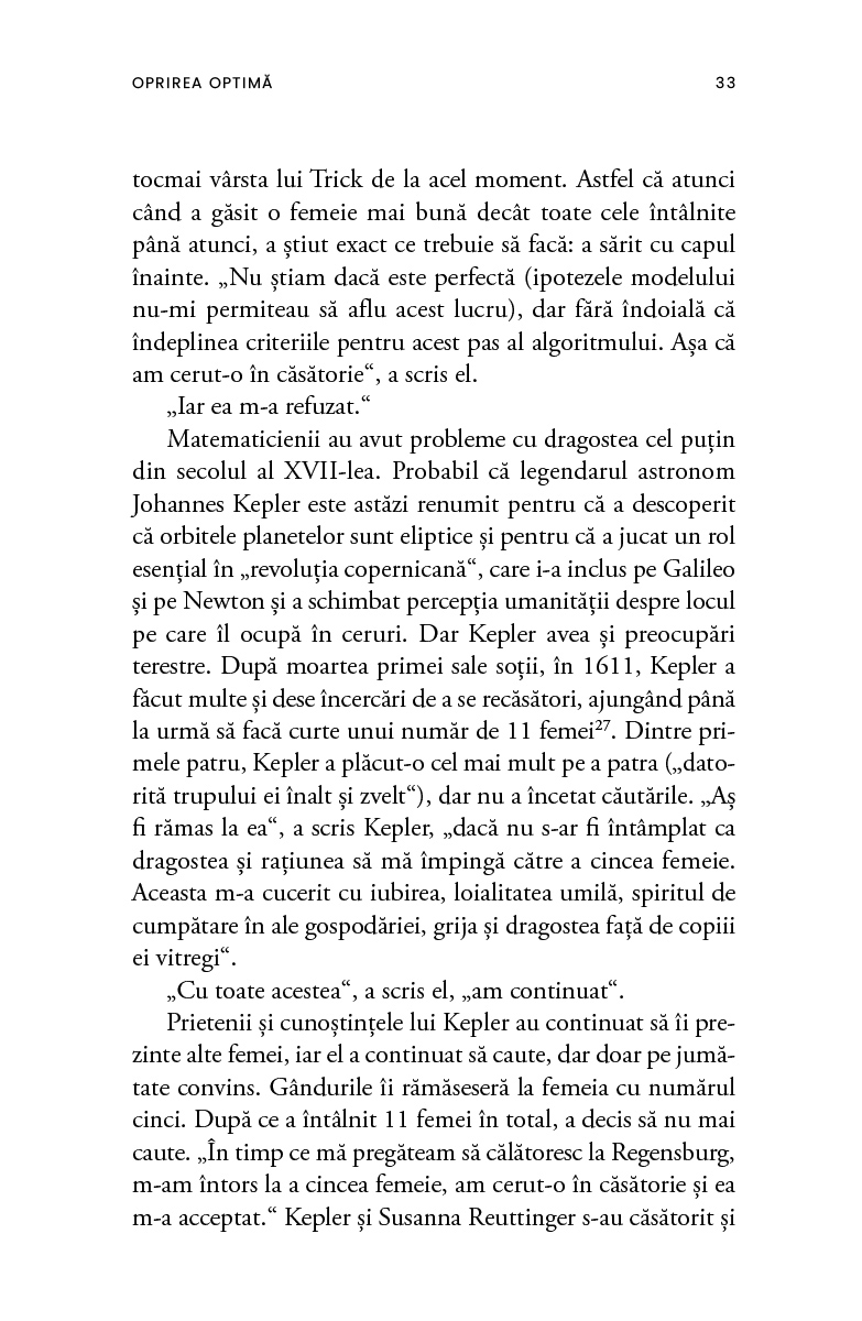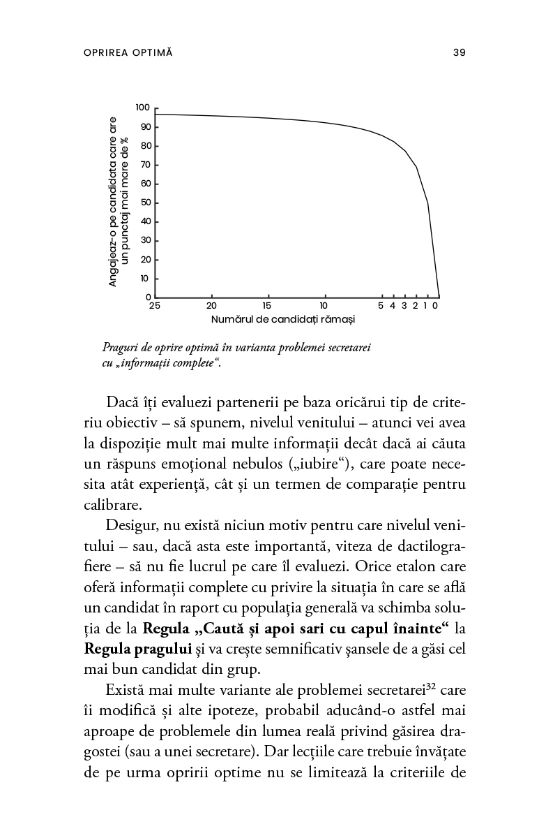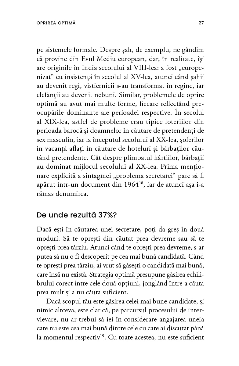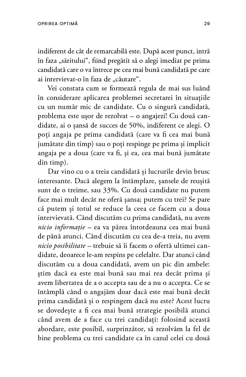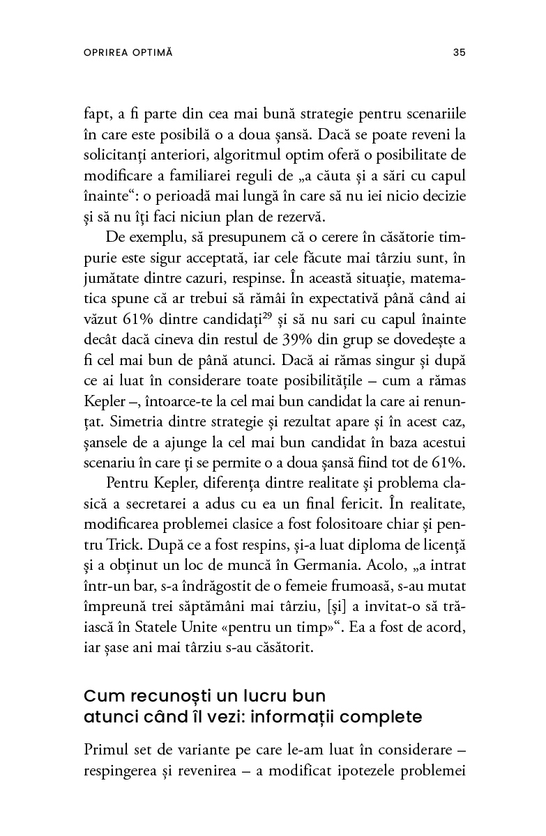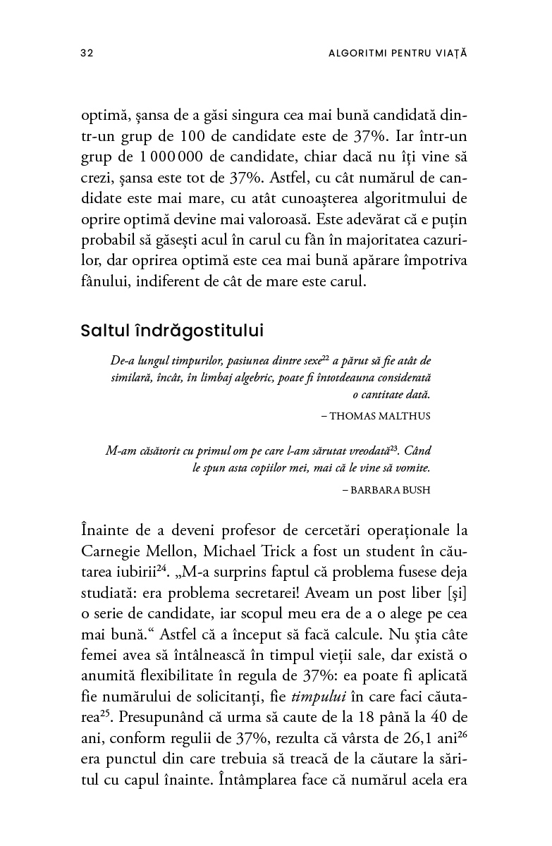 Ideile din această carte sunt gata să-ți perfecționeze modul în care abordezi probleme dintre cele mai diverse. De la căutarea unui loc de parcare sau a unui apartament până la alegerea partenerului ideal, multe situații pot fi analizate utilizând algoritmi. Cum îți poți face ordine în bibliotecă, în Inbox sau în dulap și când e bine să nu exagerezi cu aranjatul, ca să nu pierzi timpul? Când să te încrezi în intuiție și când să lași lucrurile la voia întâmplării? Unde se află echilibrul între activitățile obișnuite și cele noi? Autorii îți vor răspunde la aceste întrebări și la multe altele și îți vor demonstra că locul algoritmilor nu este doar în manualele școlare.