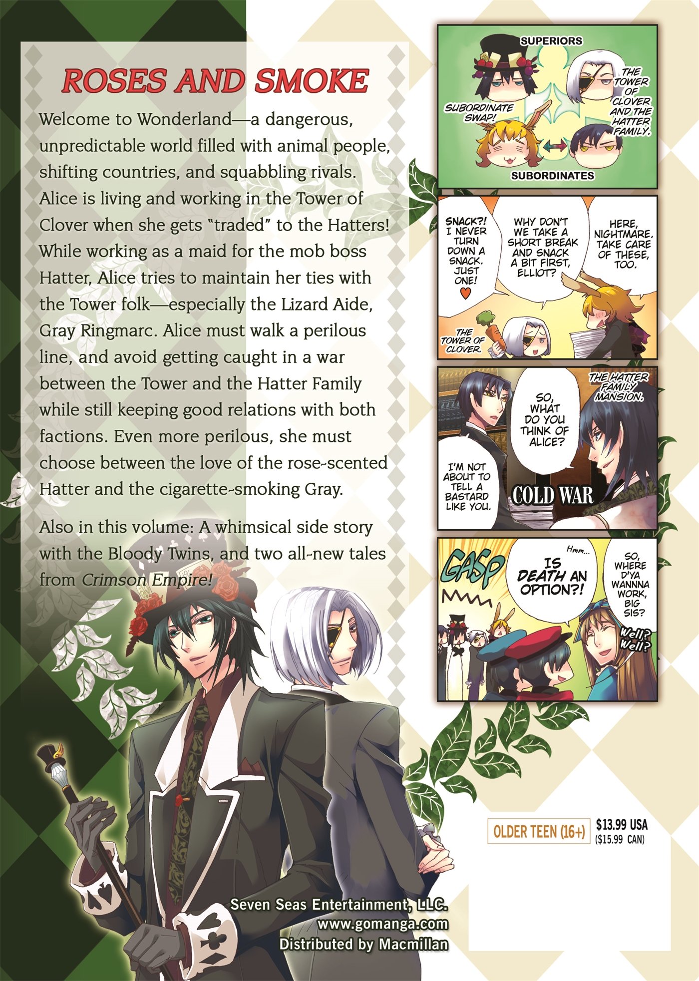 Welcome to Wonderland–a dangerous, unpredictable world filled with animal people, shifting countries, and squabbling rivals. Alice is living and working in the Tower of Clover when she gets “traded” to the Hatters! While working as a maid for the mob boss Hatter, Alice tries to maintain her ties with the Tower folk–especially the Lizard Aide, Gray Ringmarc. Alice must walk a perilous line, and avoid getting caught in a war between the Tower and Hatter Family while still keeping good relations with both factions. Even more perilous, she must choose between the love of the rose-scented Hatter and the cigarette smoking Gray.