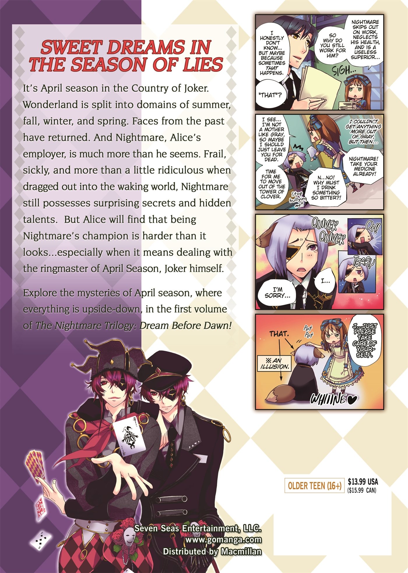 Alice in the Country of Joker: The Nightmare Trilogy chronicles the further adventures of Alice as she goes deeper down the rabbit hole. Like the other New York Times bestselling books in the Alice in the Country of Clover series, this new volume is an oversized edition that features impressive artwork and color pinups. Alice has been living in the Clover Tower for a while now, and with the coming of April Season, she is able to see Julius again and has met with Joker. Nightmare isn't very pleased, and comes up with ways to keep Alice distracted with all sorts of mini adventures. While Alice can't get away from Nightmare's penetrating gaze, she does not fear him; she may even love him. What will happen when Alice wakes up?