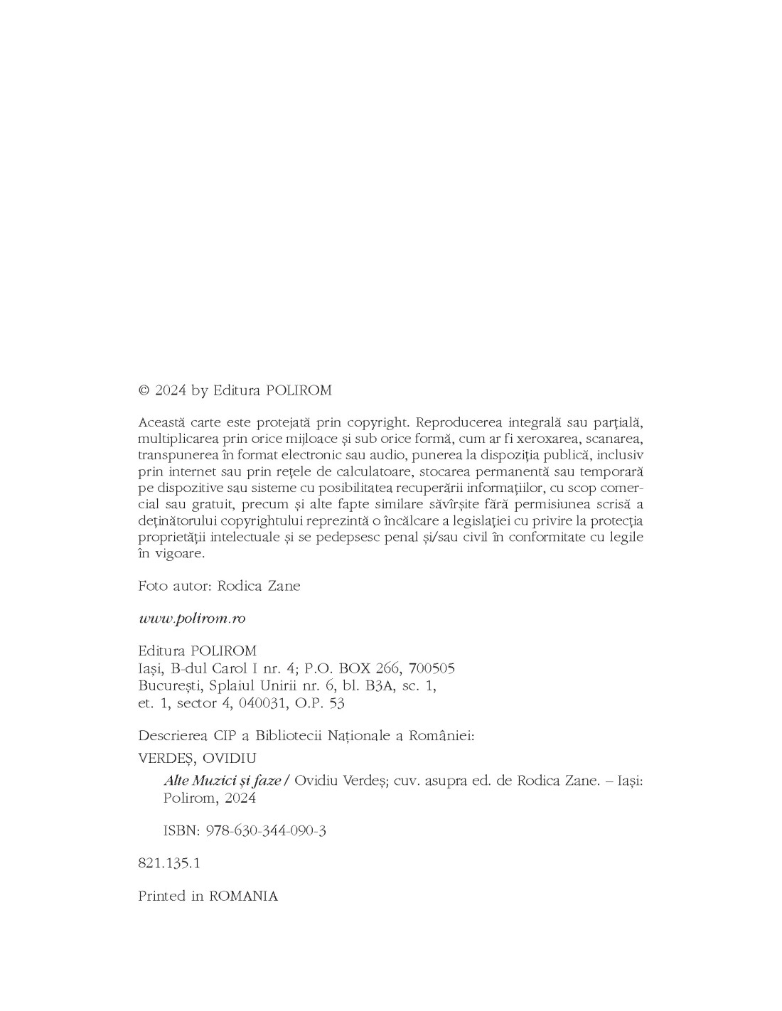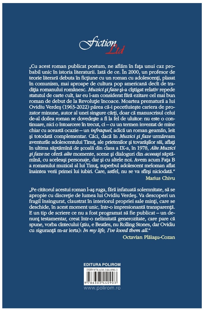 „Cu acest roman publicat postum, ne aflăm în fața unui caz probabil unic în istoria literaturii. Iată de ce. În 2000, un profesor de teorie literară debuta în ficțiune cu un roman cu adolescenți, plasat în comunism, mai aproape de cultura pop americană decât de tradiția romanului românesc. Muzici și faze și-a câștigat relativ repede statutul de carte cult, iar eu l-am considerat fără ezitare cel mai bun roman de debut de la Revoluție încoace. Moartea prematură a lui Ovidiu Verdeș (1963-2022) părea că-i pecetluiește cariera de prozator minune, autor al unei singure cărți, doar că manuscrisul celui de-al doilea roman se dovedește a fi la fel de uluitor: nu este o continuare, nici o întoarcere în trecut, ci – cu un termen inventat de mine chiar cu această ocazie – un infraquel, adică un roman geamăn, leit și totodată complementar. Căci, dacă în Muzici și faze urmăream aventurile adolescentului Tinuț, ale prietenilor și tovarășilor săi, aflați în ultima săptămână de școală din clasa a IX-a, în 1978, Alte Muzici și faze ne oferă alte momente, scene și dialoguri din aceeași săptămână, cu aceleași personaje, dar și cu altele noi. Avem acum Fața B a romanului muzical al lui Tinuț, superbul adolescent meloman aflat înaintea verii primei lui iubiri. Care, astfel, nu se va sfârși niciodată.” (Marius Chivu)