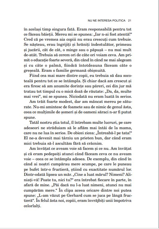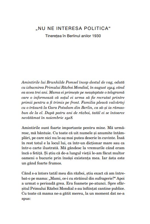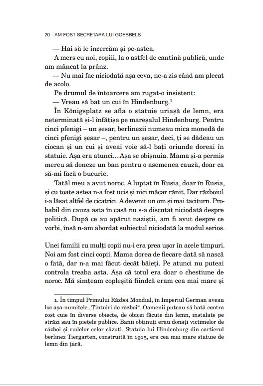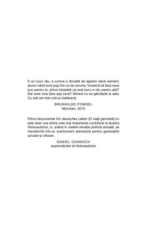 Acest volum se bazează pe convorbirile cu Brunhilde Pomsel înregistrate în 2013 și 2014, pentru filmul documentar Ein deutsches Leben (O viață germană), considerat una dintre cele mai importante contribuții la analiza Holocaustului.