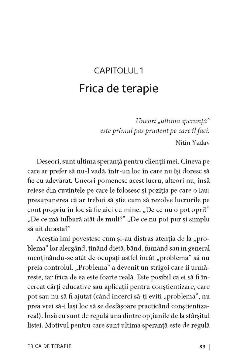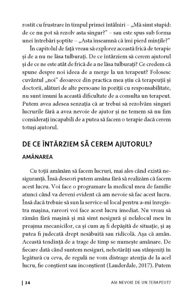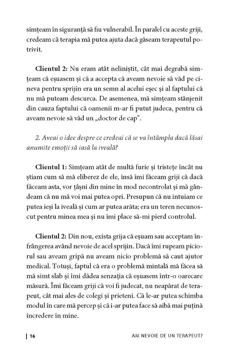 Am nevoie de un terapeut? ne oferă soluţiile de care avem nevoie pentru a depăși frica legată nu doar de ceea ce credem că spune despre noi mersul la terapeut, ci și pe cea faţă de propriile noastre emoții. Lucrarea de față aduce în discuție rolul important jucat de senzațiile noastre corporale interne în privința emoțiilor, precum și faptul că putem înțelege mai multe lucruri despre cum ne simțim, observând ceea ce se întâmplă în corpul nostru și îmbinând acest lucru cu practicarea conștientizării.