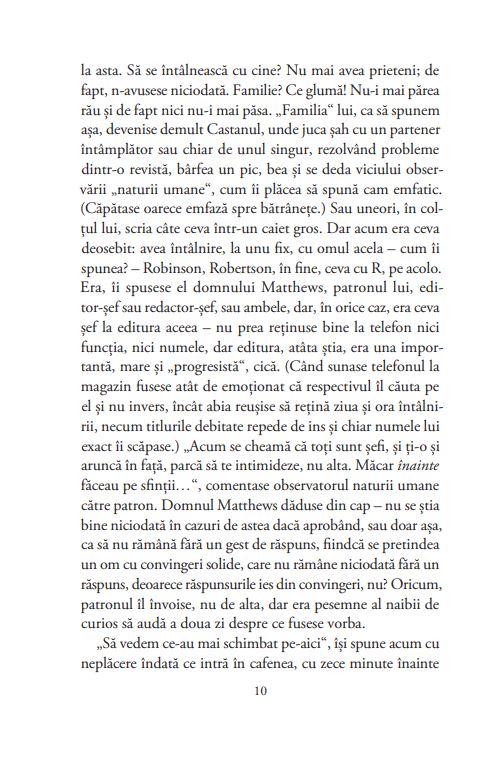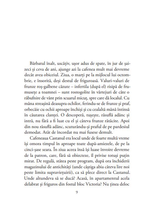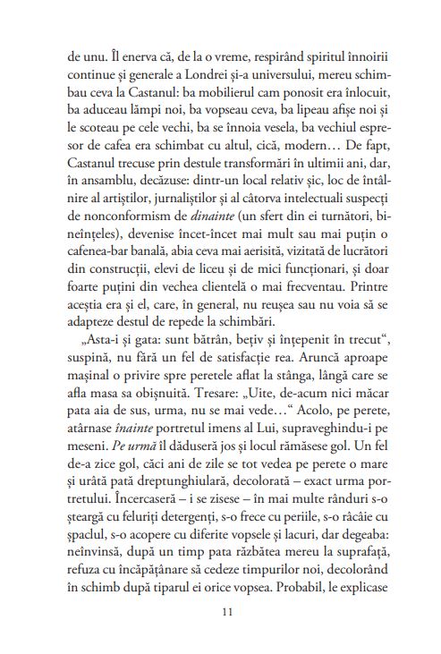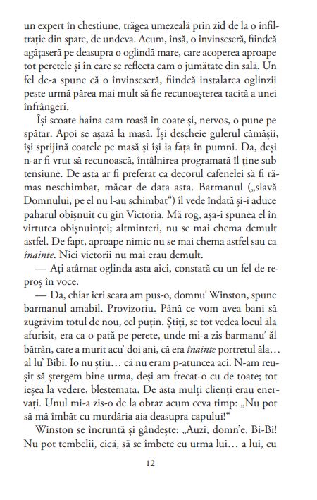Ținea minte perfect (sau așa credea) ce fusese înainte, dar, când era vorba despre ce se întâmplase după, anii i se învălmășeau în cap și totul plutea într-un fel de negură, care anihila limitele lunilor și anilor. A fost mult, a fost puțin – parcă totul nu fusese decât un pe urmă prelungit luni și ani de zile. Un provizorat, o tranziție (spre ce?), o trecere spre altă viață (care?); așa că, deși unele detalii îi erau clare, întregul, sensul general al mișcării rămâneau obscure. Pesemne că totul se schimba prea repede; lucrurile vechi piereau pe neașteptate, oameniise îmbrăcau mereu altfel, arătau altfel (mai ales femeile), casele vechi erau dărâmate sau revopsite, străzile căpătau mereu alte nume, se puneau alte afișe și alte semne de circulație; până și bordurile trotuarelor le schimbau frenetic. Apăreau mereu trenuri noi, mașini noi, telefoane noi, ziare noi, tâmpenii noi și mai ales oameni noi care pățeau țanțoși, enervanți, nestingheriți de trecut. Iar de felul adevărat de viață de dinainte își aminteau tot mai puțini. Lumea citea cu nesaț ziarele, se uita la noile tele-ecrane și comenta tot felul de noutăți, scandaluri, crime, filme, dive, sport, jafuri, șomaj, bătăi, revolte, greve, dar despre ce făcuse sau ce fusese fiecare înainte nimeni nu voia să vorbească ori pretindea cu seninătate că nu ținea minte, sau chiar că lucrurile fuseseră cu totul altfel decât știa el bine că fuseseră. Fiindcă el chiar știa.