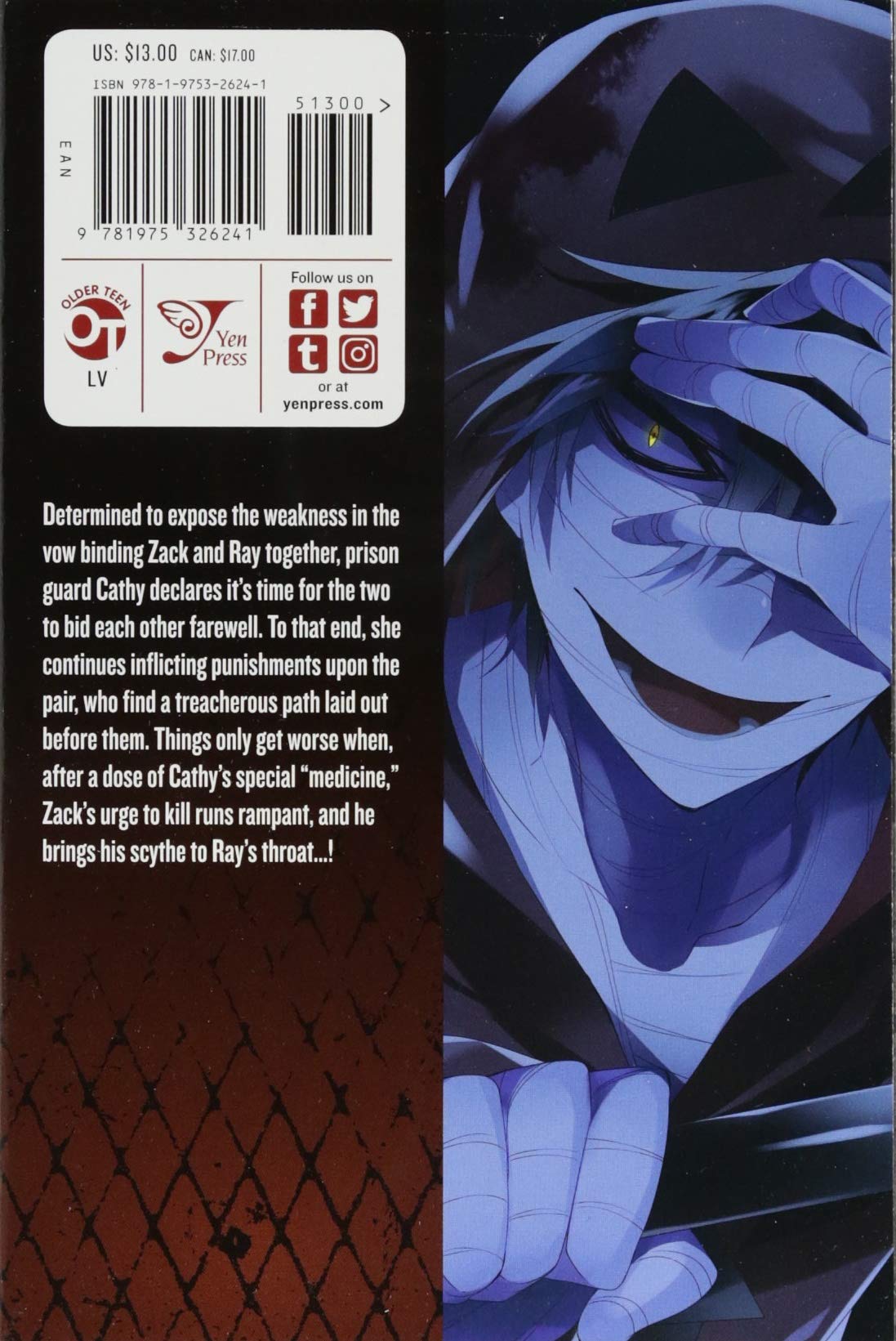 Determined to expose the weakness in the vow binding Zack and Ray together, prison guard Cathy declares it's time for the two to bid each other farewell. To that end, she continues inflicting punishments upon the pair, who find a treacherous path laid out before them. Things only get worse when, after a dose of Cathy's special "medicine," Zack's urge to kill runs rampant, and he brings his scythe to Ray's throat...!