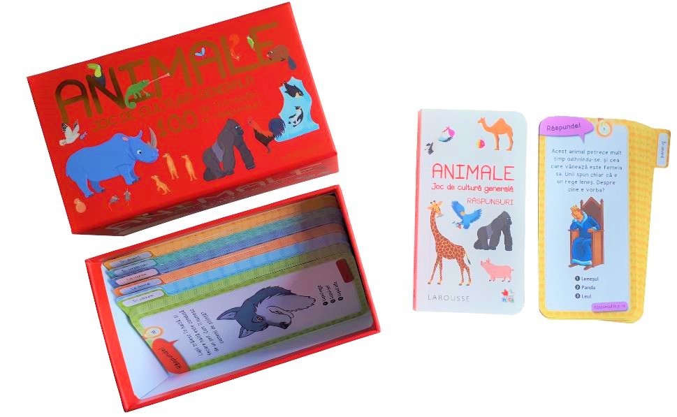 100 de cărți de joc, cu câte o întrebare despre un animal. Există două tipuri de întrebări: întrebări cu răspunsuri multiple și întrebări deschise.