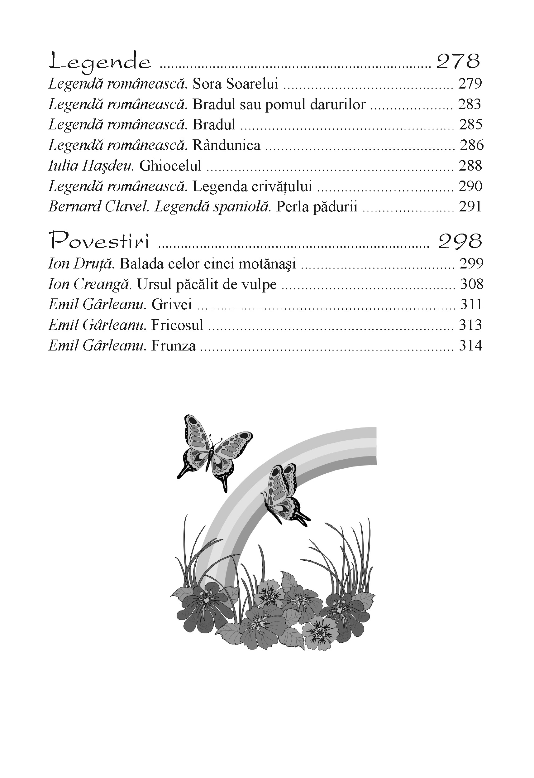 În carte sunt incluse circa 40 de poveşti, legende, basme şi povestiri din cultura românească şi cea universală. Textele sunt semnate de scriitori celebri, cum ar fi Ch. Perrault, H. Ch. Andersen, fraţii Grimm, I. Creangă, P. Ispirescu sau sunt culese din folclor.
