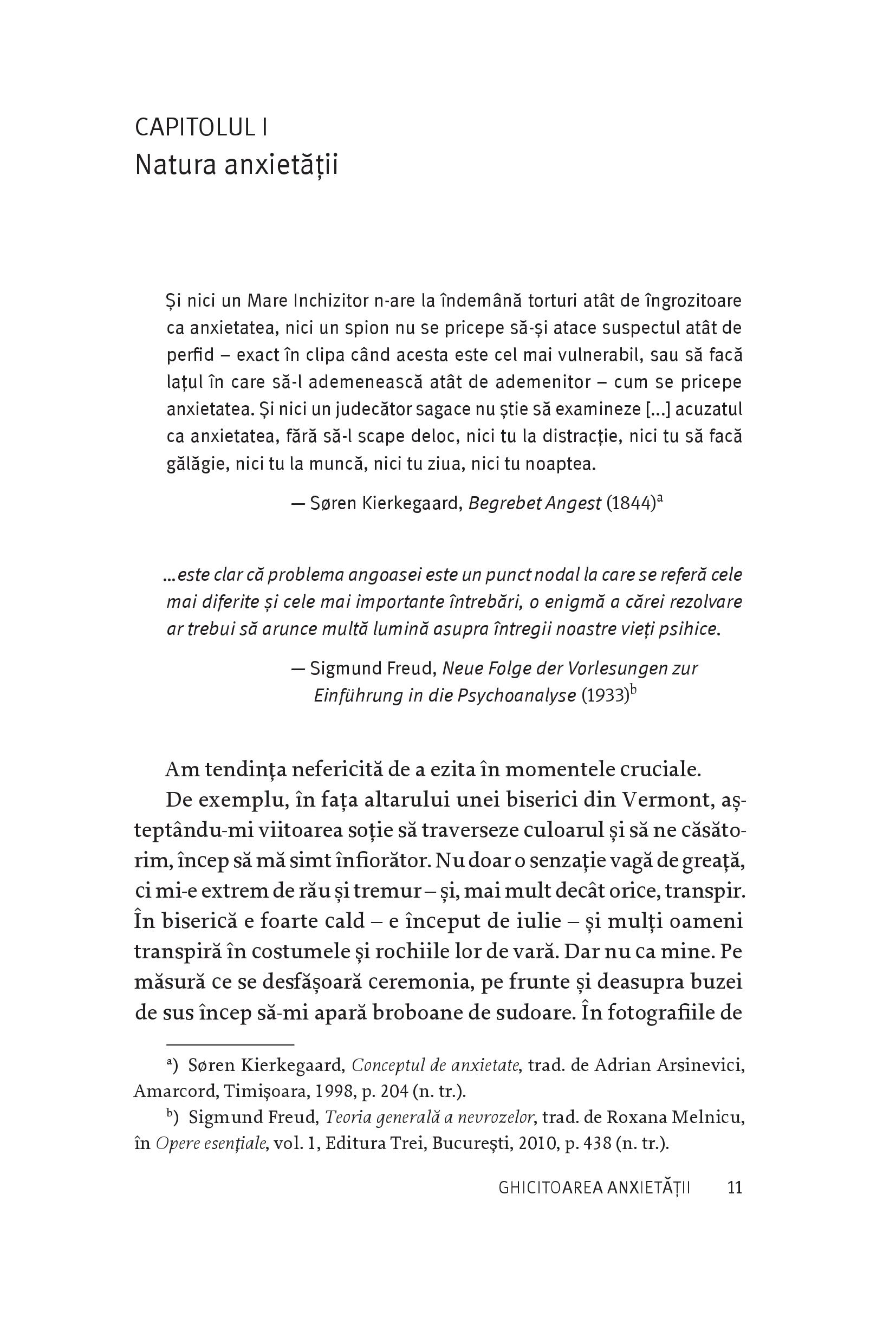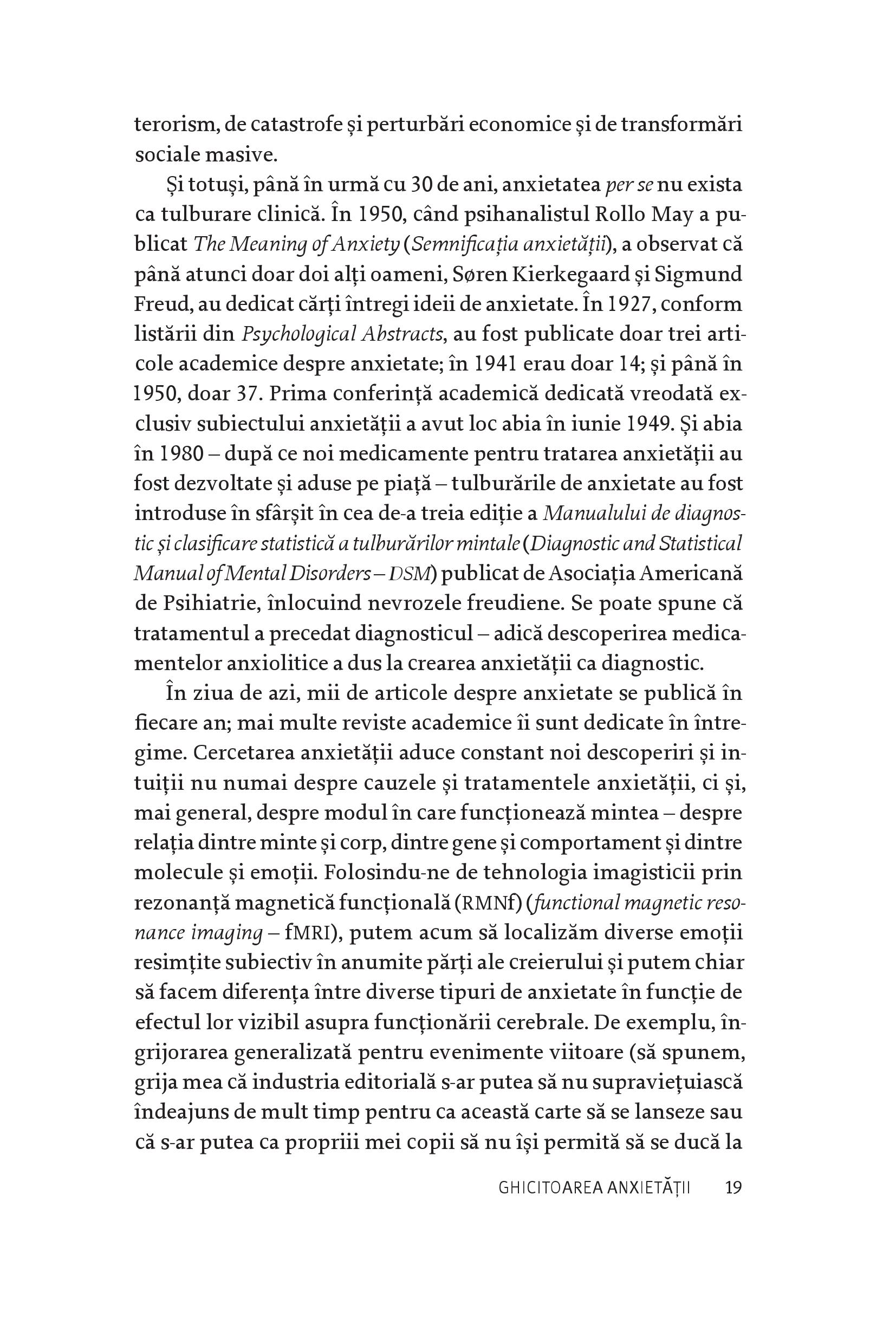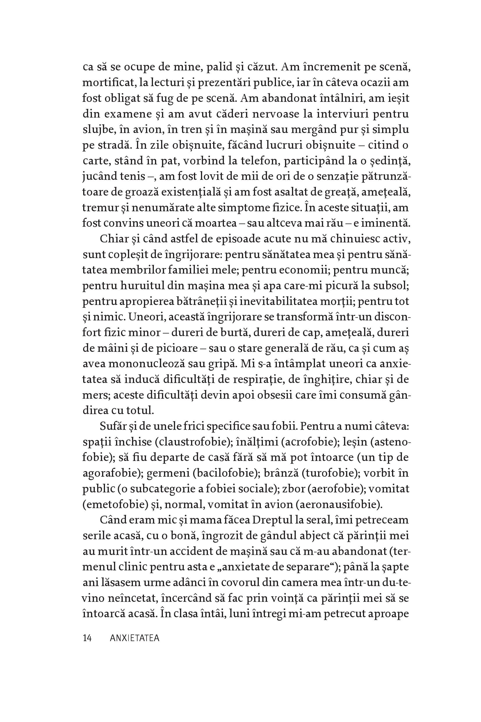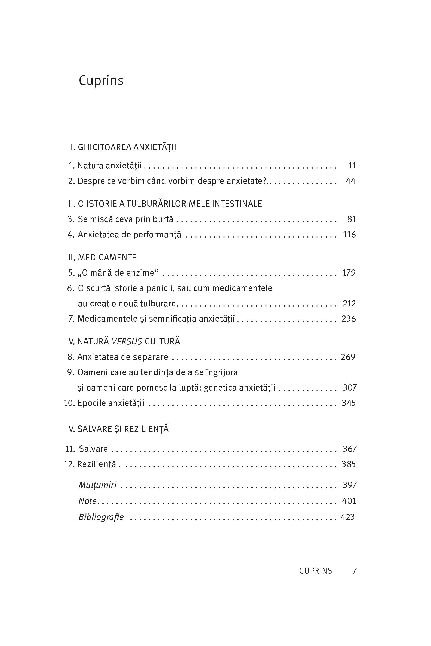 Pornind de la propria sa luptă cu anxietatea, Scott Stossel retrasează în această carte o lungă istorie medicală, culturală, filozofică și socială, de la Galen și Hipocrate, trecând prin Robert Burton și Kierkegaard, Darwin, William James și Freud, până în prezent. Explorând ceea ce treptat s-a cristalizat conceptual și clinic ca anxietate, de la medicina antică, încă legată de filozofie, până la neuroștiințele și genetica din ultimele decenii, Stossel ne oferă numeroase exemple de bolnavi celebri, precum și o galerie (autoironică și savuroasă) de portrete de familie. Tabloul oferit de Stossel este complet, informat, empatic: nenumăratele forme de manifestare clinică ale anxietății; impactul lor asupra vieților bolnavilor și ale celor din jurul lor, asupra societății în ansamblu; cauzele biologice, culturale și sociale ale bolii; cele mai diverse încercări de a aborda boala și bolnavii, uneori dincolo de limita fraudei medicale; uriașele costuri materiale și umane. Dar și modalitățile de a lupta cu anxietatea, de a o ține sub control și de a putea ajunge sau reveni astfel la viața relativ normală.