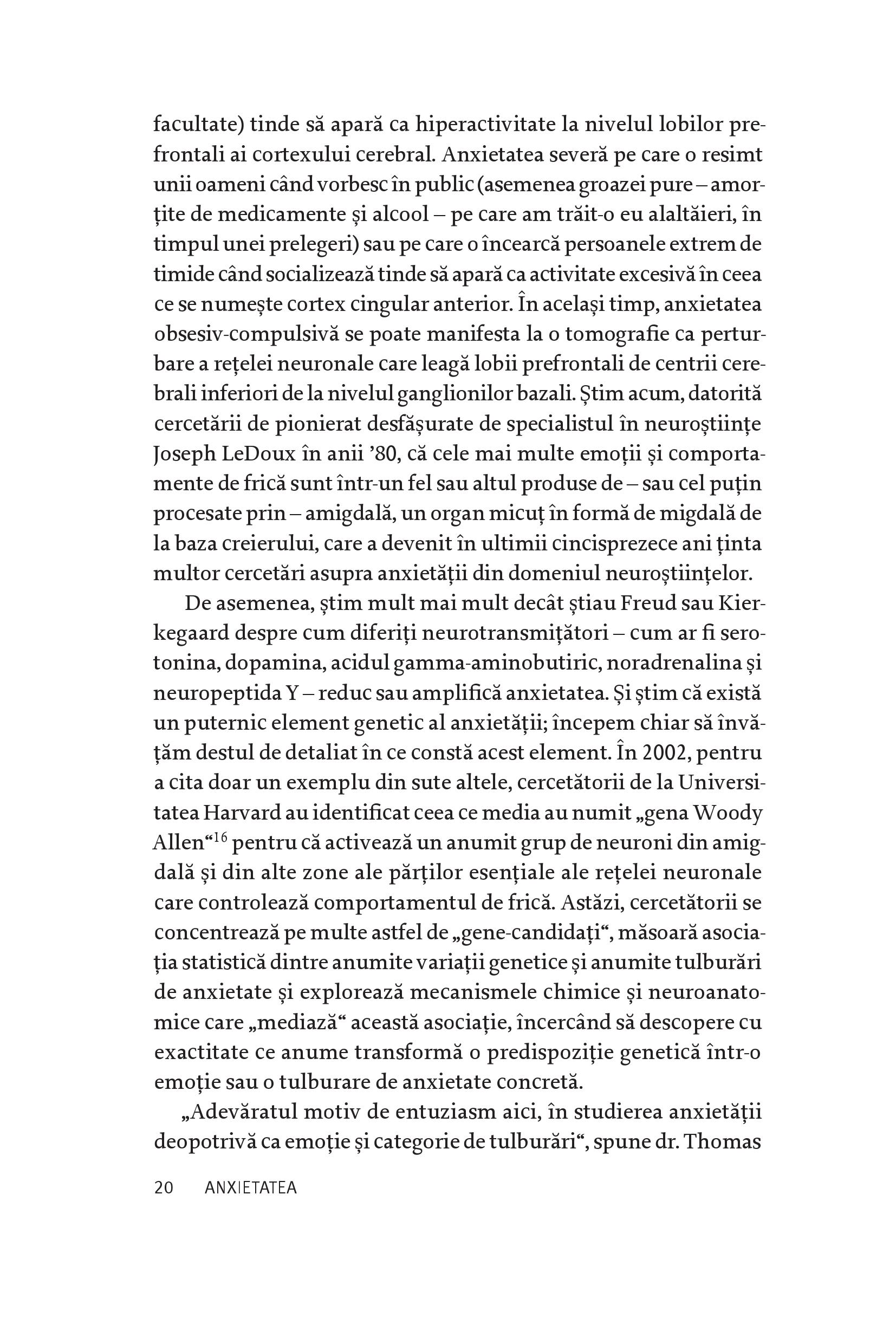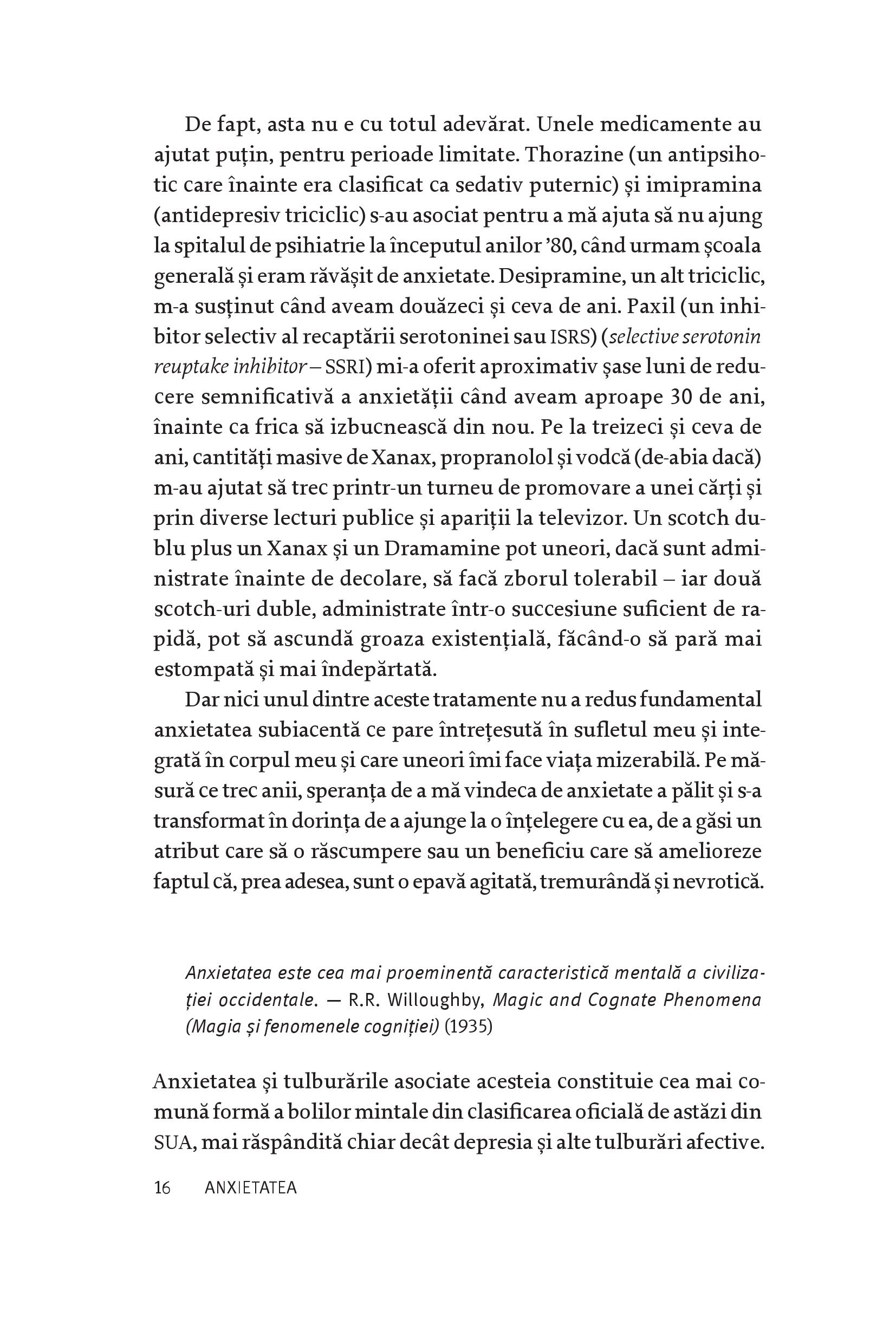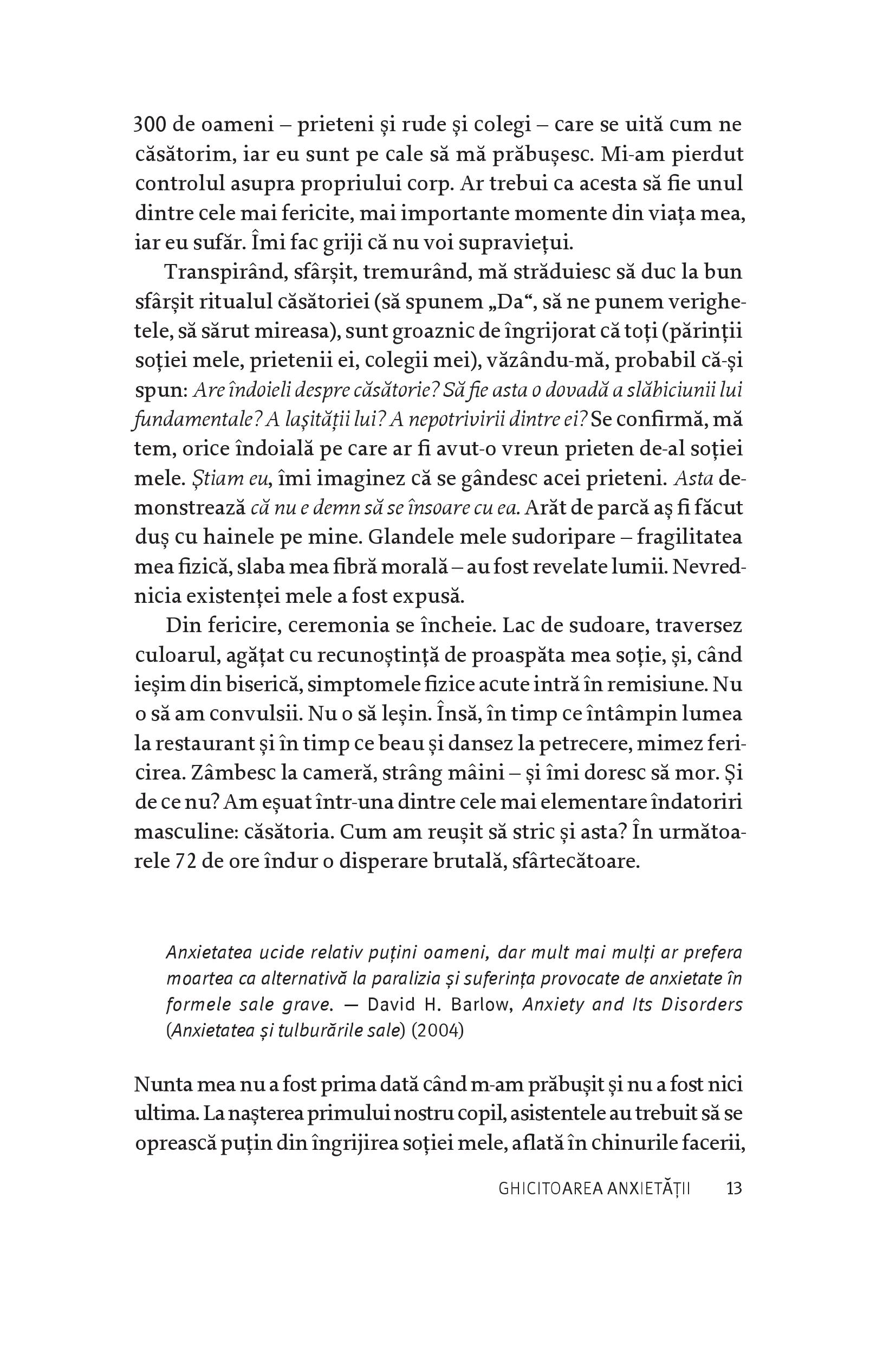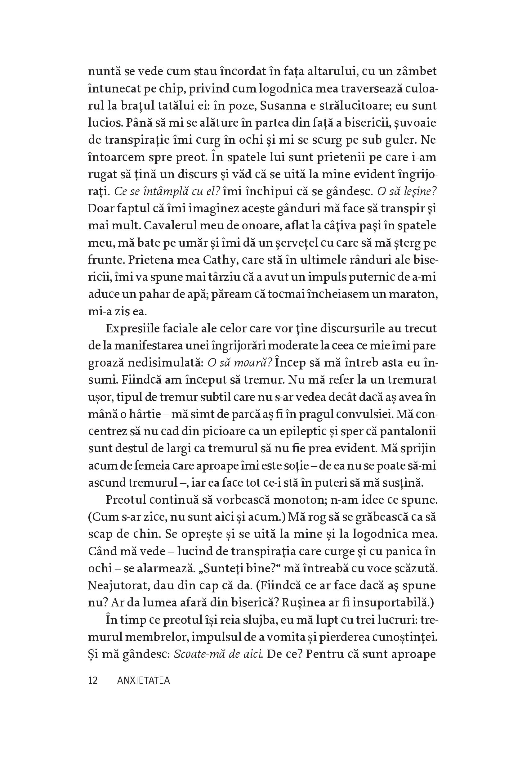 Pornind de la propria sa luptă cu anxietatea, Scott Stossel retrasează în această carte o lungă istorie medicală, culturală, filozofică și socială, de la Galen și Hipocrate, trecând prin Robert Burton și Kierkegaard, Darwin, William James și Freud, până în prezent. Explorând ceea ce treptat s-a cristalizat conceptual și clinic ca anxietate, de la medicina antică, încă legată de filozofie, până la neuroștiințele și genetica din ultimele decenii, Stossel ne oferă numeroase exemple de bolnavi celebri, precum și o galerie (autoironică și savuroasă) de portrete de familie. Tabloul oferit de Stossel este complet, informat, empatic: nenumăratele forme de manifestare clinică ale anxietății; impactul lor asupra vieților bolnavilor și ale celor din jurul lor, asupra societății în ansamblu; cauzele biologice, culturale și sociale ale bolii; cele mai diverse încercări de a aborda boala și bolnavii, uneori dincolo de limita fraudei medicale; uriașele costuri materiale și umane. Dar și modalitățile de a lupta cu anxietatea, de a o ține sub control și de a putea ajunge sau reveni astfel la viața relativ normală.