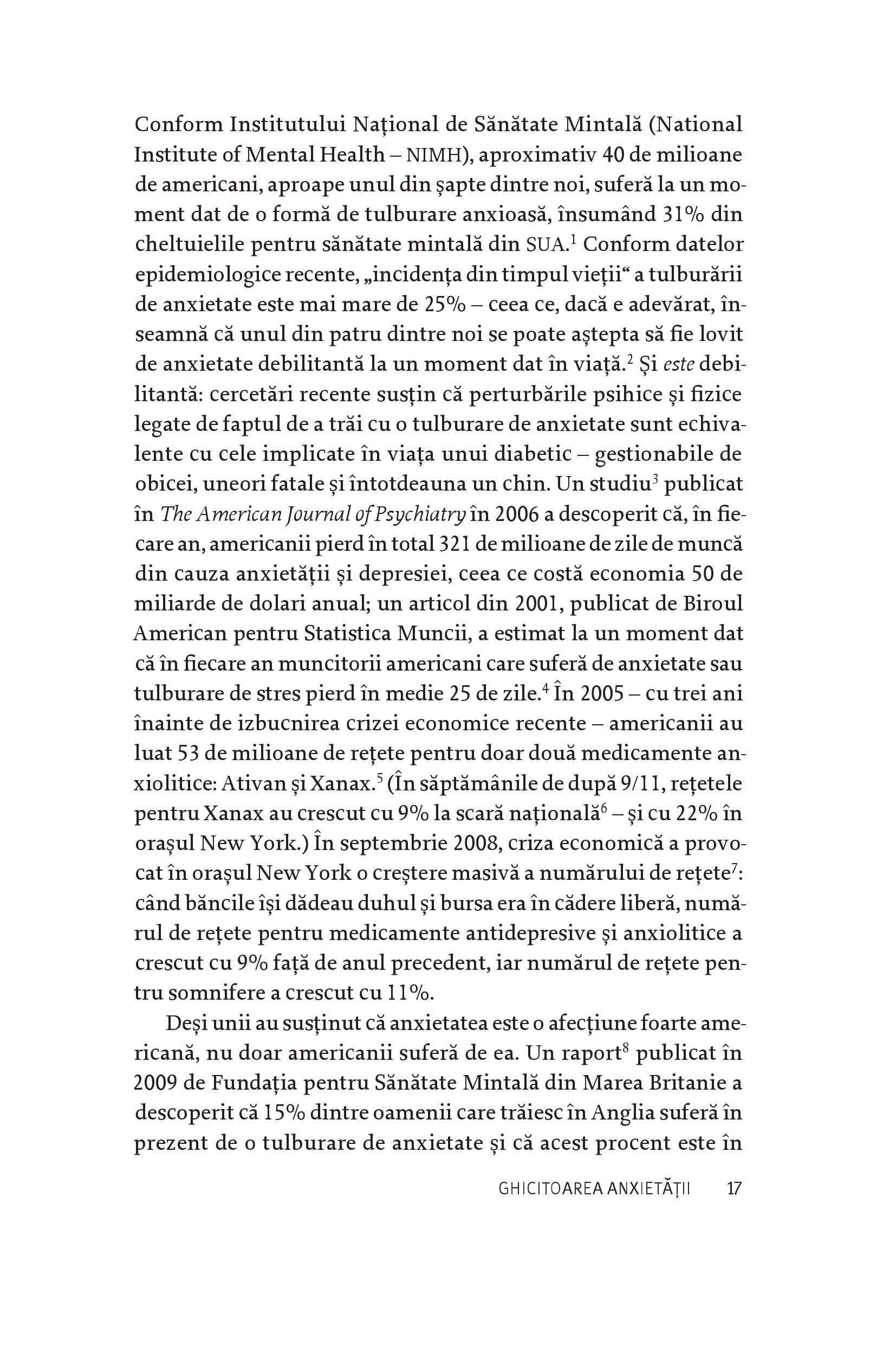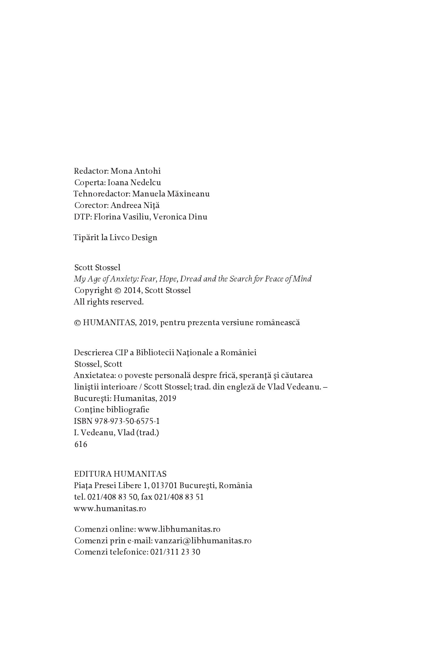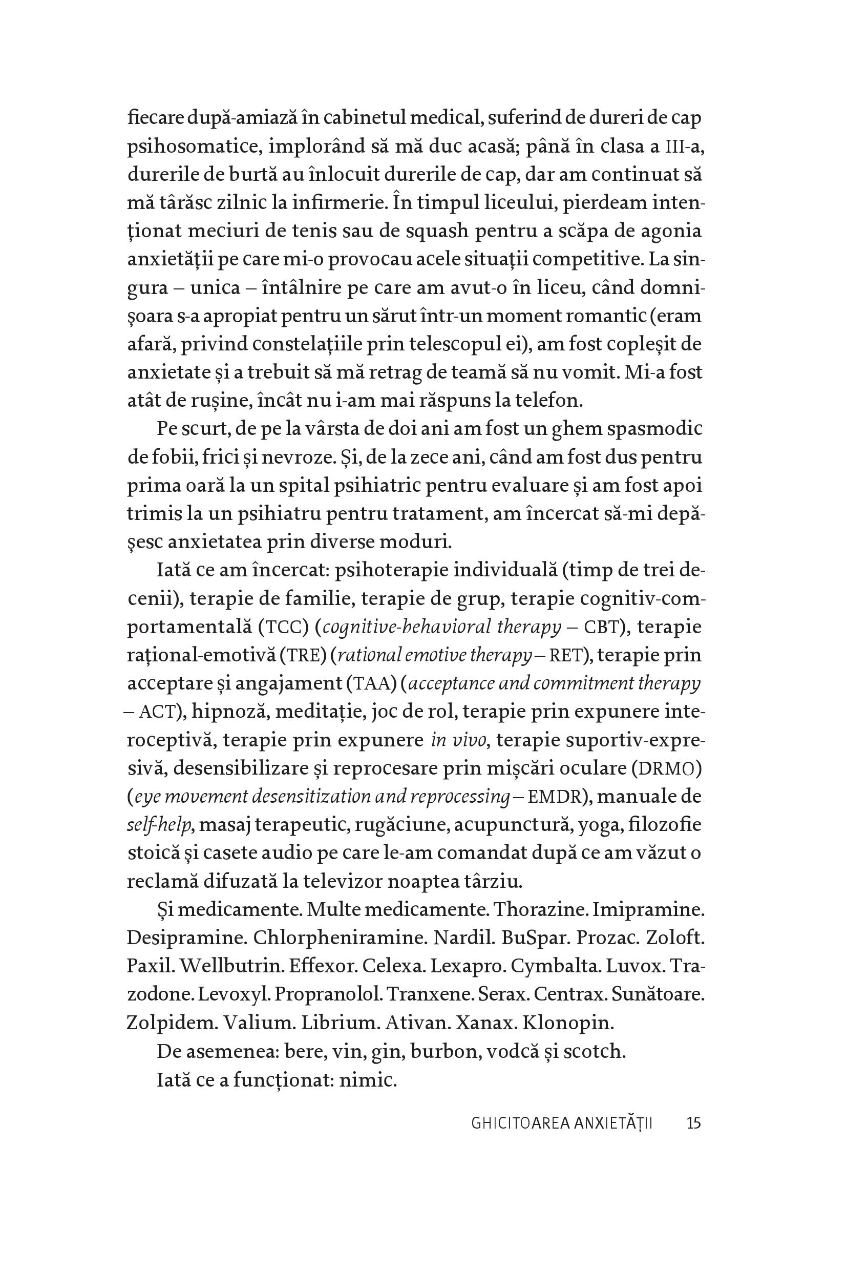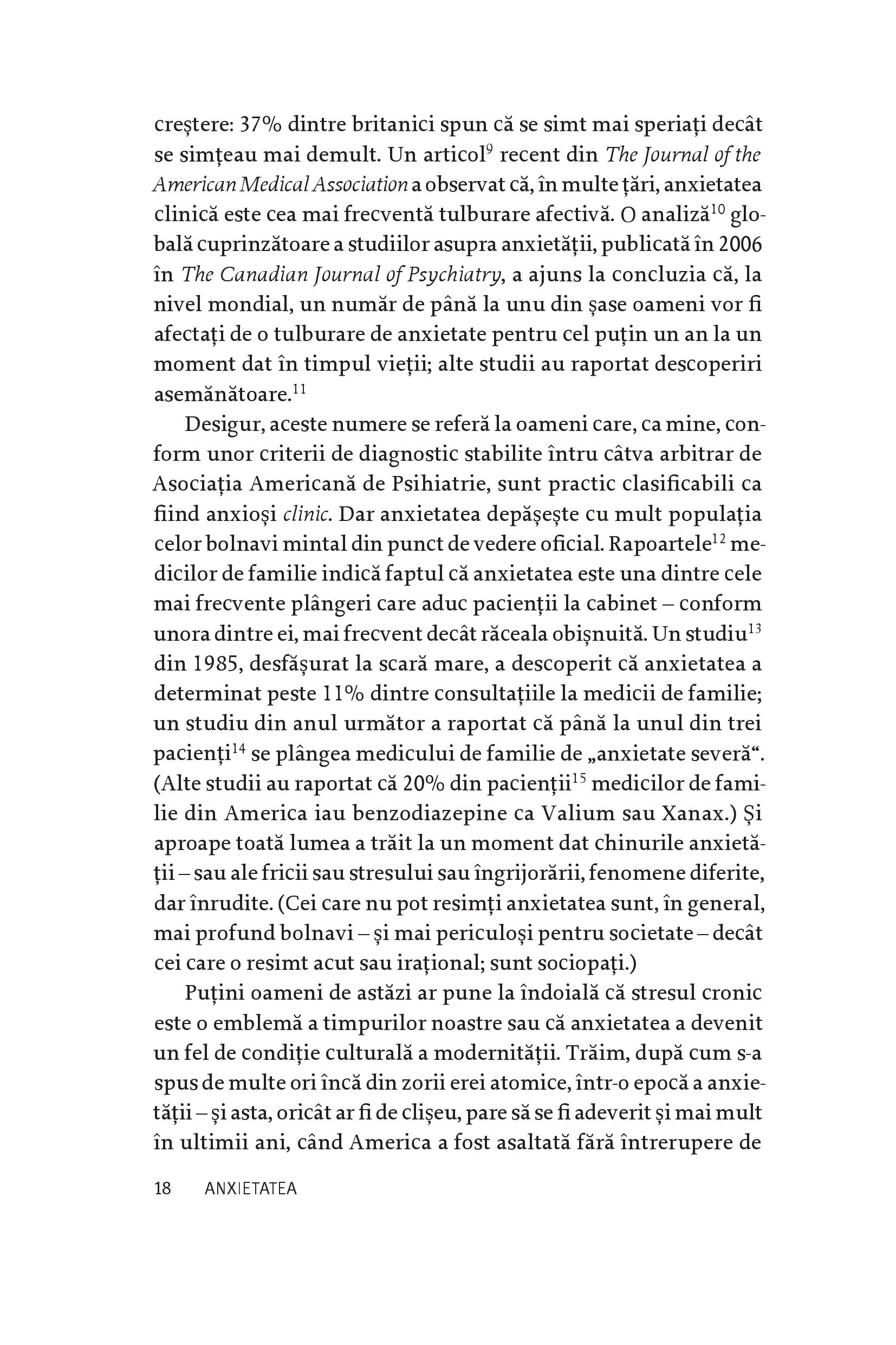 Pornind de la propria sa luptă cu anxietatea, Scott Stossel retrasează în această carte o lungă istorie medicală, culturală, filozofică și socială, de la Galen și Hipocrate, trecând prin Robert Burton și Kierkegaard, Darwin, William James și Freud, până în prezent. Explorând ceea ce treptat s-a cristalizat conceptual și clinic ca anxietate, de la medicina antică, încă legată de filozofie, până la neuroștiințele și genetica din ultimele decenii, Stossel ne oferă numeroase exemple de bolnavi celebri, precum și o galerie (autoironică și savuroasă) de portrete de familie. Tabloul oferit de Stossel este complet, informat, empatic: nenumăratele forme de manifestare clinică ale anxietății; impactul lor asupra vieților bolnavilor și ale celor din jurul lor, asupra societății în ansamblu; cauzele biologice, culturale și sociale ale bolii; cele mai diverse încercări de a aborda boala și bolnavii, uneori dincolo de limita fraudei medicale; uriașele costuri materiale și umane. Dar și modalitățile de a lupta cu anxietatea, de a o ține sub control și de a putea ajunge sau reveni astfel la viața relativ normală.