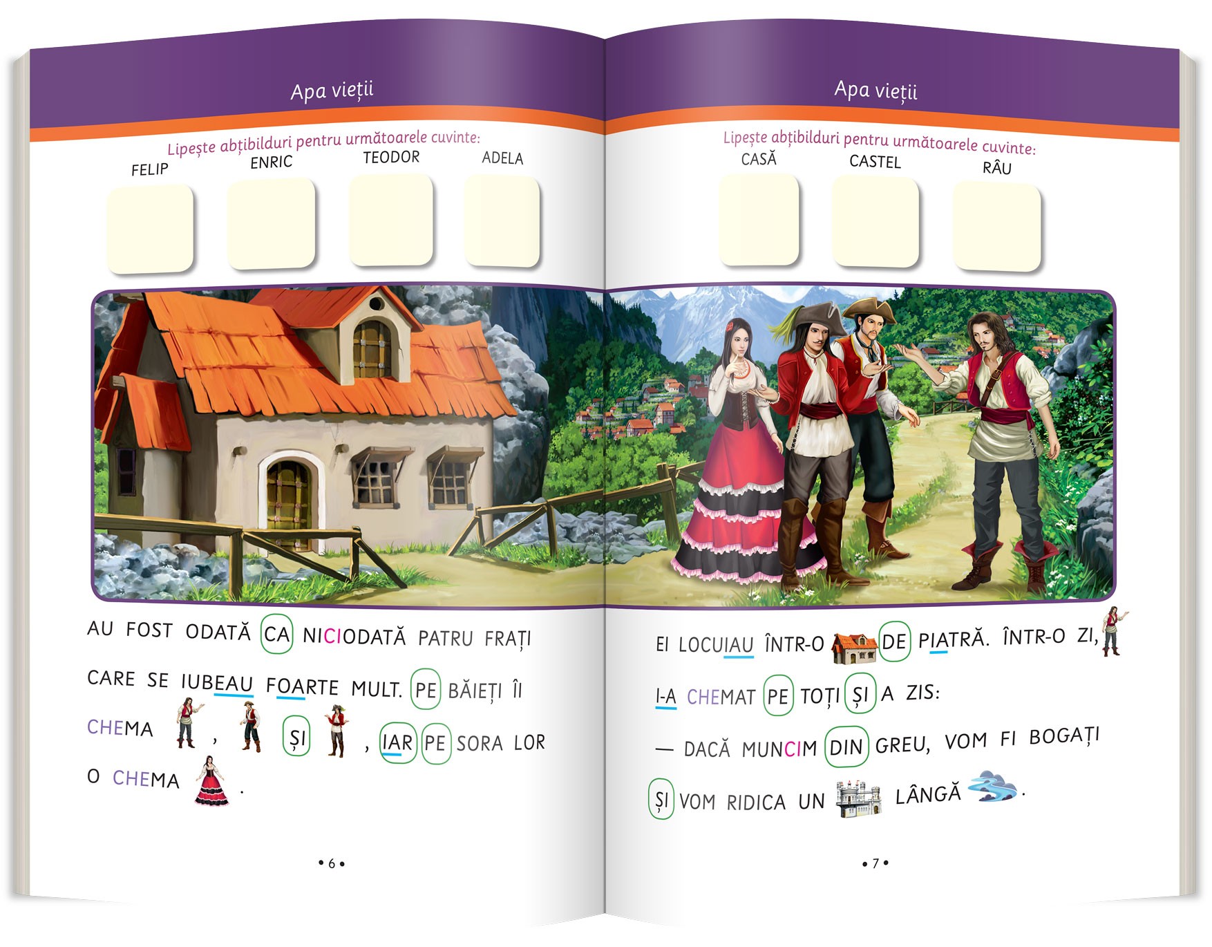 Din a doua poveste lipsesc pictogramele, dar majusculele și evidențierile au fost păstrate. În josul paginii sunt întrebări legate de text.
