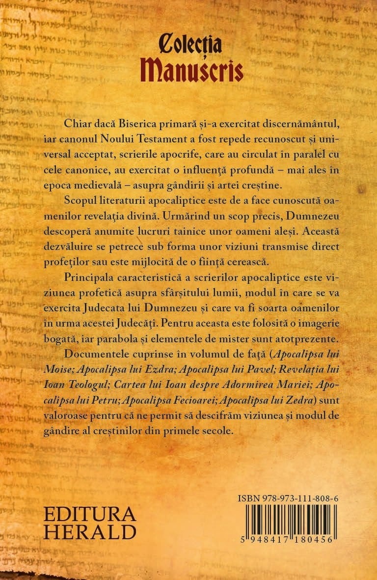 Acest volum ofera o perspectiva ampla asupra scrierilor apocaliptice atribuite figurilor centrale ale crestinismului timpuriu care nu au fost incluse in canonul Noului Testament, precum Apocalipsa lui Petru, Apocalipsa Fecioarei sau Apocalipsa lui Zedra.