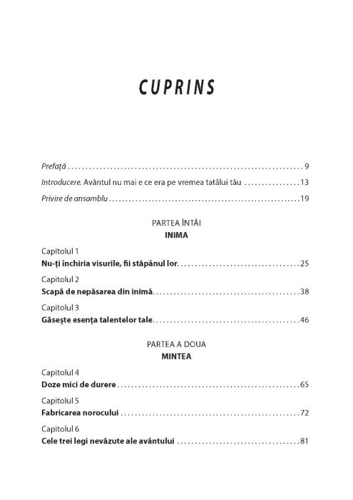 În această lucrare, organizată în trei părţi – INIMA, MINTEA, OBICEIURILE –, autorii ne prezintă o metodă revoluţionară, care ne va ajuta să învăţăm cum să ne redefinim obiectivele pentru a găsi calea optimă spre succes, folosind câteva sfaturi eficiente, de multe ori contraintuitive, care ne vor învăţa: