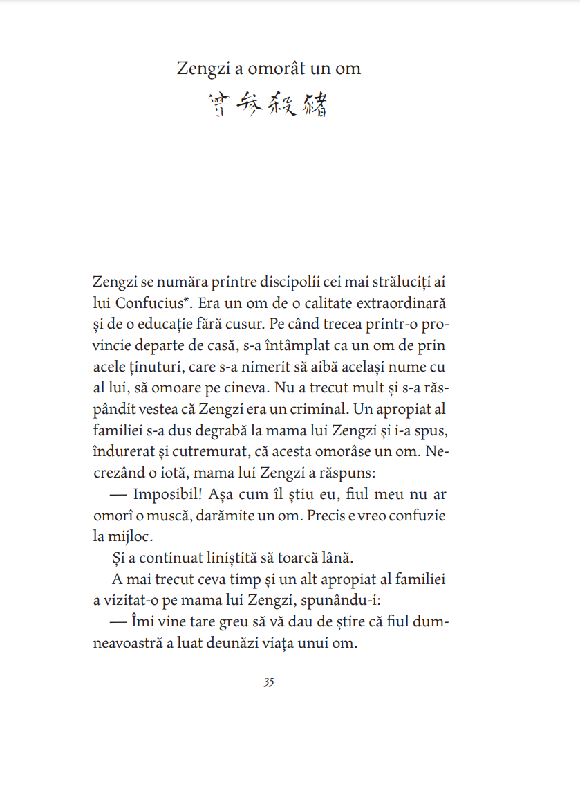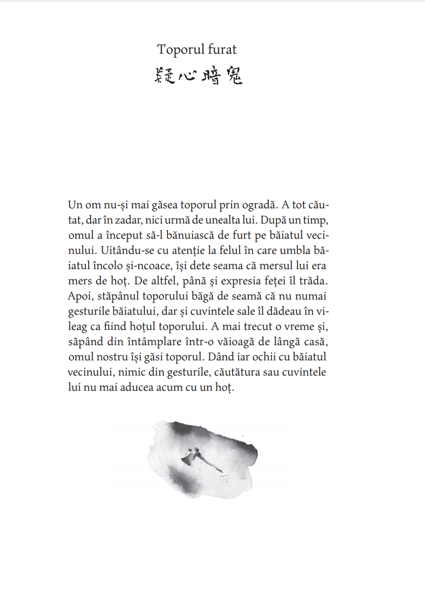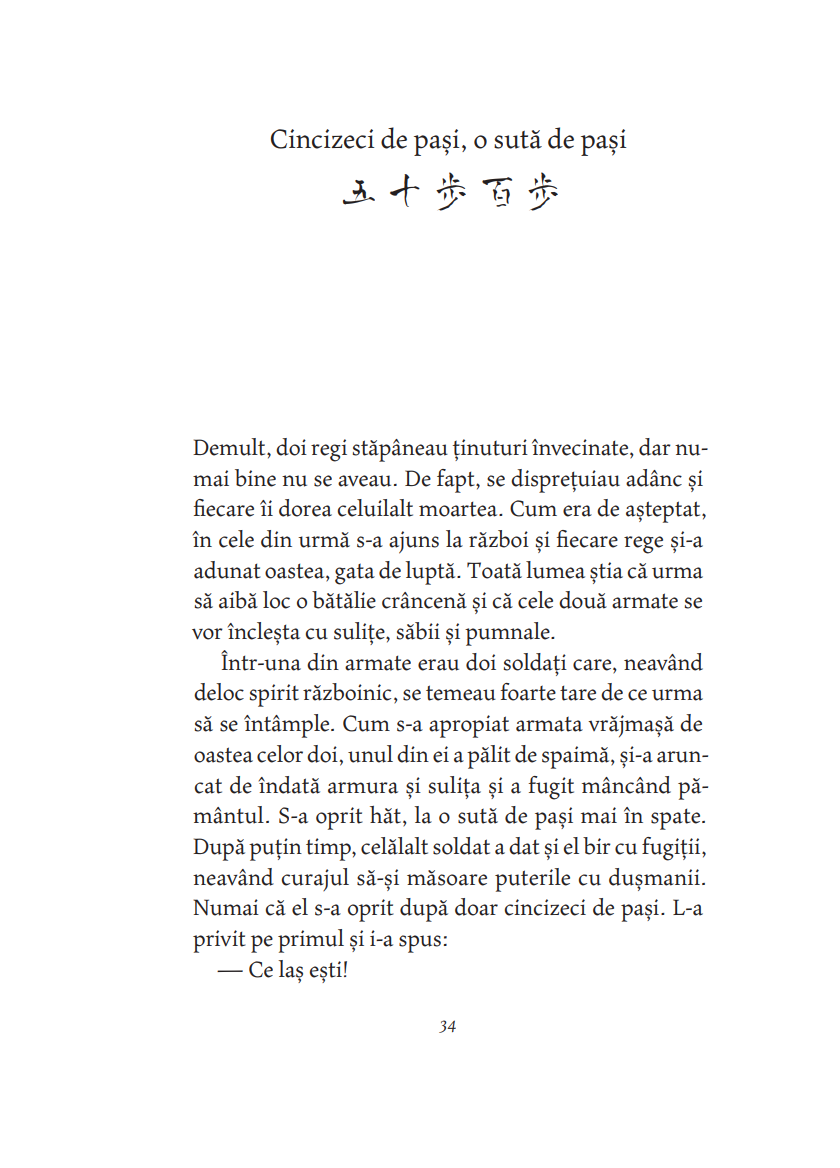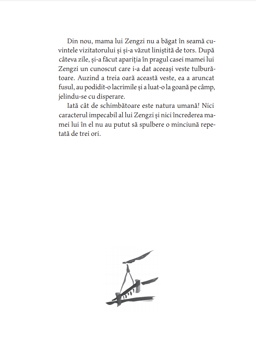 ― Arc? Ce arc? a răspuns bătrânul maestru râzând. Atâta timp cât ai nevoie de arc și de săgeată încă tragi cu arcul. Când tragi cu arcul fără arc, nu ai nevoie nici de arc, nici de săgeată. Tocmai atunci, în înaltul cerului se rotea în zbor lin un uliu. Era atât de departe, încât părea a fi doar o sămânţă de susan. Gan Ying l-a privit un timp, apoi l-a ochit, făcând gestul de a pune o săgeată în arc. Numai că nu avea nici arc și nici săgeată. Pe urmă a întins arcul nevăzut la maximum, ca o lună plină, și, deodată, a slobozit săgeata, și ea nevăzută. Fulgerat, uliul nici măcar nu a mai apucat să zvâcnească din aripi și a căzut ca o piatră din cer. Ji Chang a rămas trăsnit. Pentru prima oară a văzut cu ochii lui măiestria desăvârșită a trasului cu arcul. — Arcașul fără arc