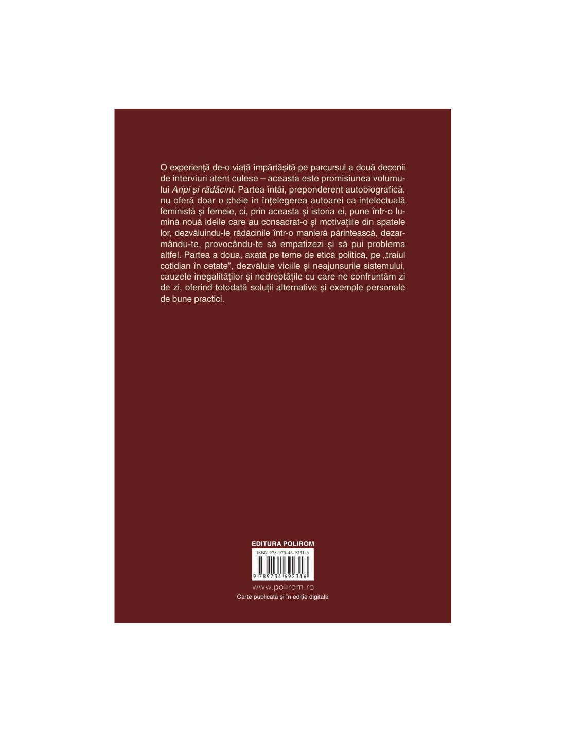 O experiență de-o viață împărtășită pe parcursul a două decenii de interviuri atent culese – aceasta este promisiunea volumului Aripi și rădăcini. Partea întâi, preponderent autobiografică, nu oferă doar o cheie în înțelegerea autoarei ca intelectuală feministă și femeie, ci, prin aceasta și istoria ei, pune într-o lumină nouă ideile care au consacrat-o și motivațiile din spatele lor, dezvăluindu-le rădăcinile într-o manieră părintească, dezarmându-te, provocându-te să empatizezi și să pui problema altfel. Partea a doua, axată pe teme de etică politică, pe „traiul cotidian în cetate”, dezvăluie viciile și neajunsurile sistemului, cauzele inegalităților și nedreptățile cu care ne confruntăm zi de zi, oferind totodată soluții alternative și exemple personale de bune practici.