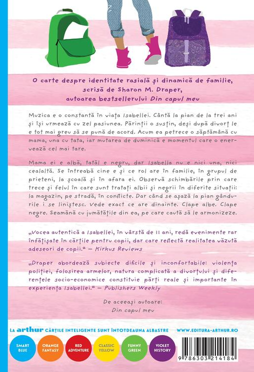 Mama ei e albă, tatăl e negru, dar Isabella nu e nici una, nici cealaltă. Se întreabă cine e și ce rol are în familie, în grupul de prieteni, la școală și în afara ei. Observă schimbările prin care trece și felul în care sunt tratați albii și negrii în diferite situații: la magazin, pe stradă, în conflicte. Dar când se așază la pian gândurile i se liniștesc. Vede exact ce are dinainte. Clape albe. Clape negre. Seamănă cu jumătățile din ea, pe care caută să le armonizeze.