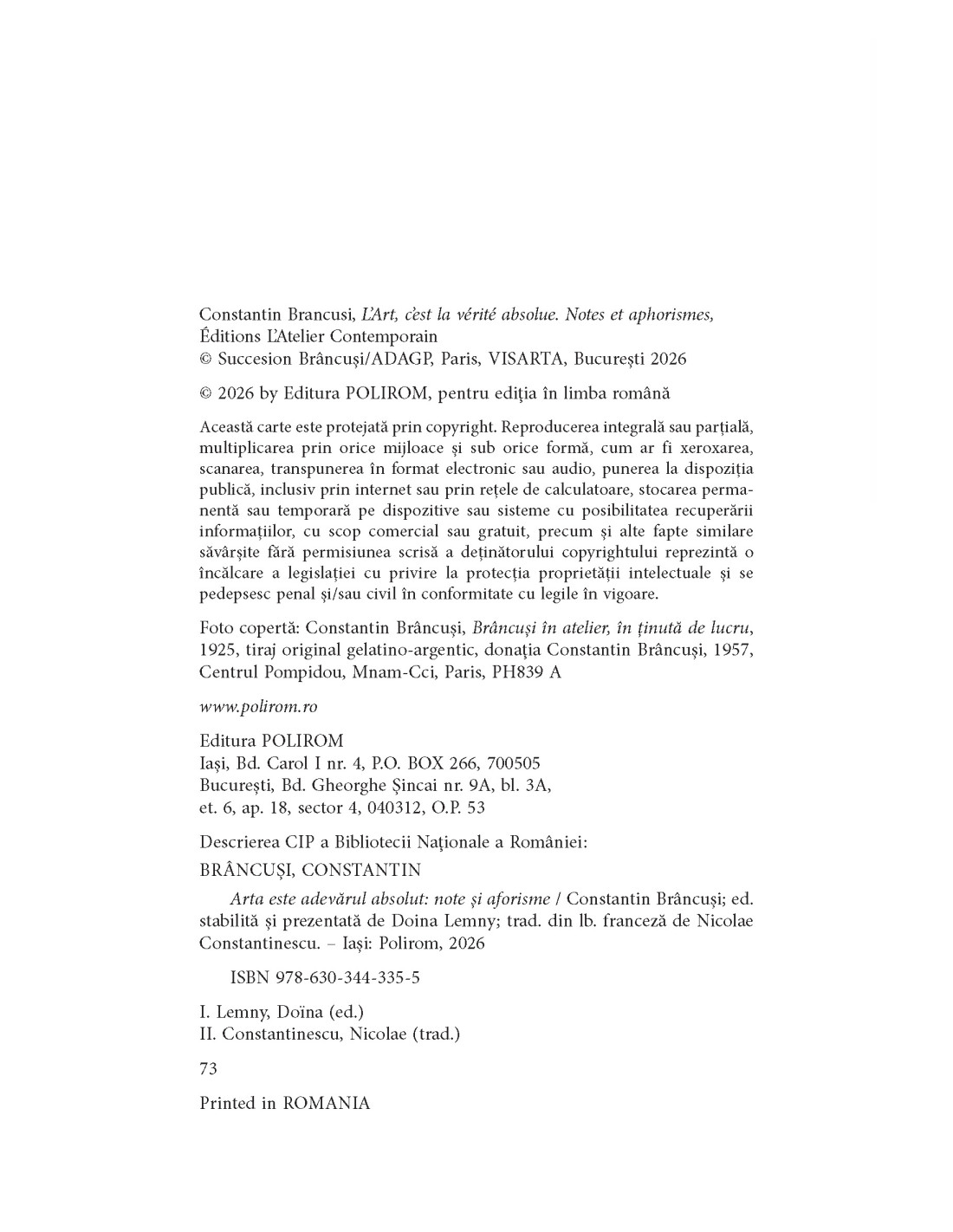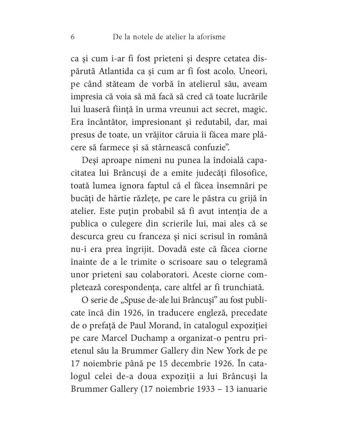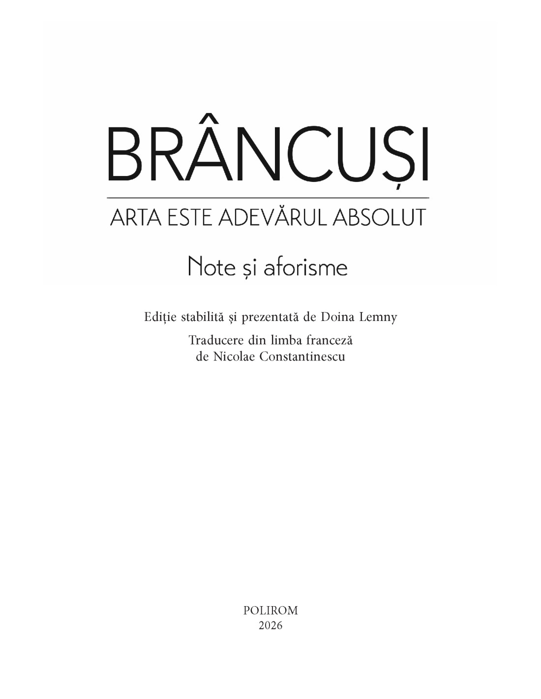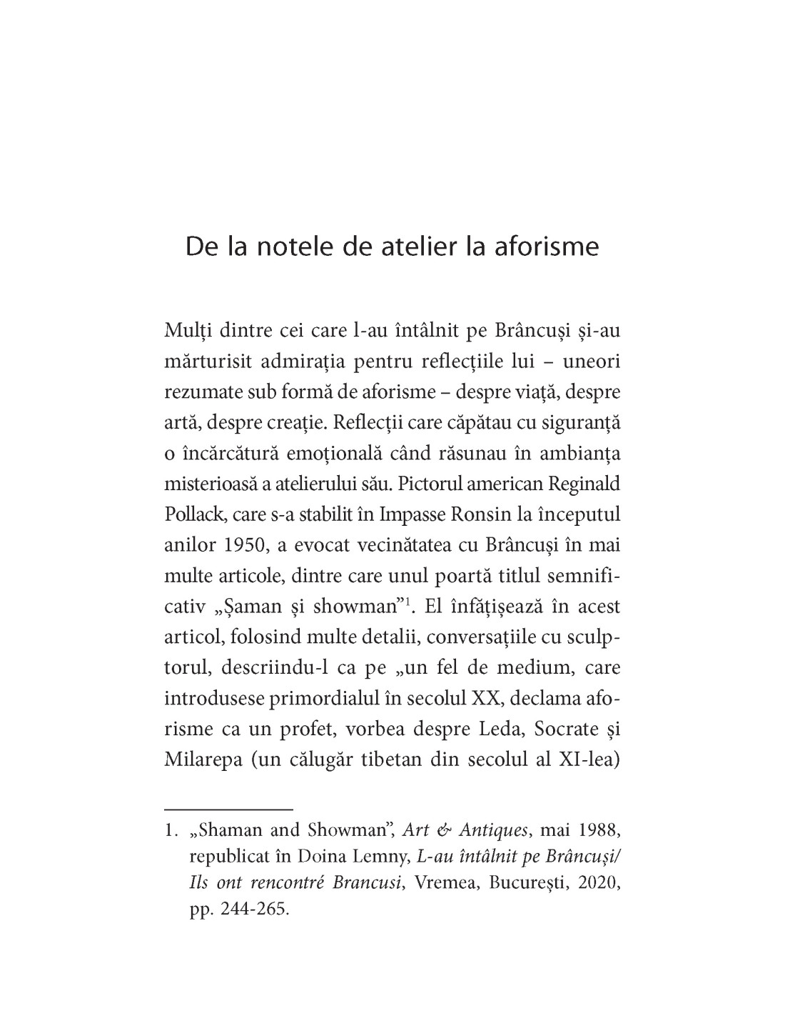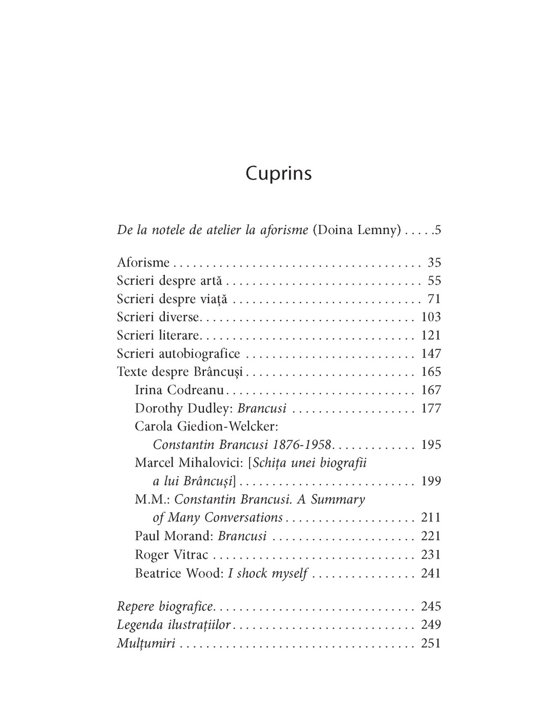 Doina Lemny reunește pentru prima dată notele sale de atelier – diverse fraze, aforisme și chiar texte literare scrise de Brâncuși – preluându-le în forma în care le-a scris artistul, păstrate și clasificate în Fondul Brâncuși de la Biblioteca Kandinsky, Centrul Pompidou, Paris.