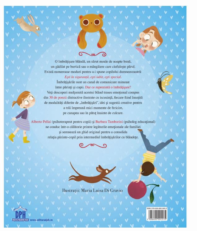 Alberto Pellai (psihoterapeut pentru copii) si Barbara Tamborini (psiholog educational) ne conduc intr-o calatorie printre legaturile emotionale ale familiei si semneaza un ghid original pentru a consolidarelatia parinte-copil prin intermediul Imbratisarilor cu blandete.