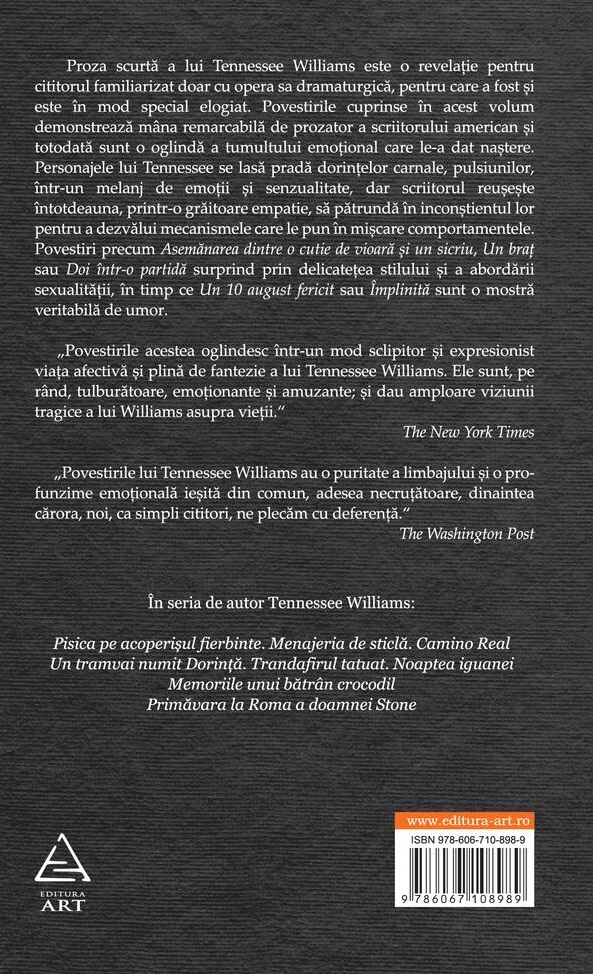 Proza scurtă a lui Tennessee Williams este o revelație pentru cititorul familiarizat doar cu opera sa dramaturgică, pentru care a fost și este în mod special elogiat. Povestirile cuprinse în acest volum demonstrează mâna remarcabilă de prozator a scriitorului american și totodata sunt o oglindă a tumultului emoțional care le-a dat naștere. Personajele lui Tennessee se lasă pradă dorințelor carnale, pulsiunilor, într-un melanj de emoții și senzualitate, dar scriitorul reușește întotdeauna, printr-o grăitoare empatie, să pătrundă în inconștientul lor pentru a dezvălui mecanismele care le pun în mișcare comportamentele. Povestiri precum Asemănarea dintre o cutie de vioară și un sicriu, Un braț sau Doi într-o partidă surprind prin delicatețea stilului și a abordării sexualității, în timp ce Un 10 august fericit sau Împlinită sunt o mostră veritabilă de umor.