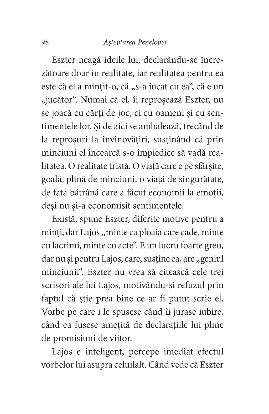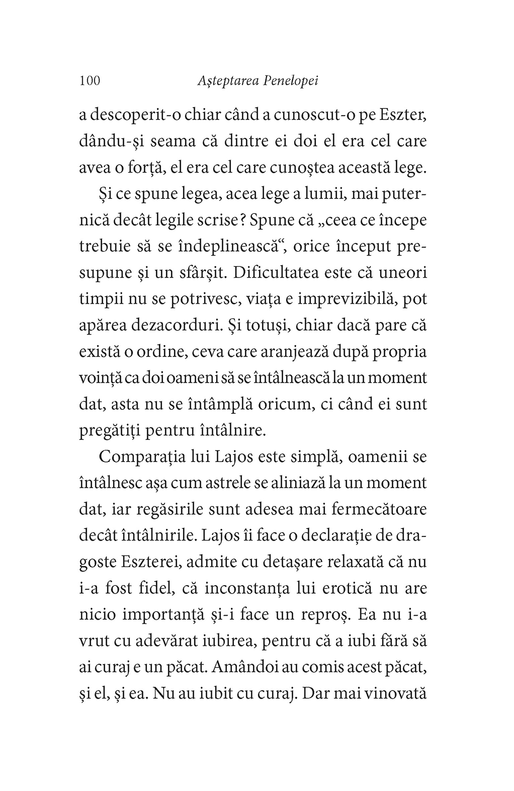 De ce unii aşteaptă ani la rînd să fie alături de persoana iubită, în timp ce alţii nu au răbdare şi îşi continuă viaţa fără să mai privească în urmă? Încercînd să înţeleagă aşteptarea ca alegere voluntară care ne modelează destinul, Aurora Liiceanu se îndreaptă către lumea literaturii şi pune sub lupă cîteva personaje a căror viaţă a fost marcată de aşteptare, dar şi personaje grăbite, care nu ştiu să aştepte. Poveştile fascinante pe care le relatează îi au ca protagonişti, între alţii, pe Penelopa, mitica soţie a lui Ulise, pe Ernest Hemingway şi pe prima lui soţie, Hadley, pe Gatsby al lui Scott Fitzgerald, pe cunoscutul niponolog Donald Keene şi pe Florentino Ariza, eroul lui García Márquez din Dragostea în vremea holerei.