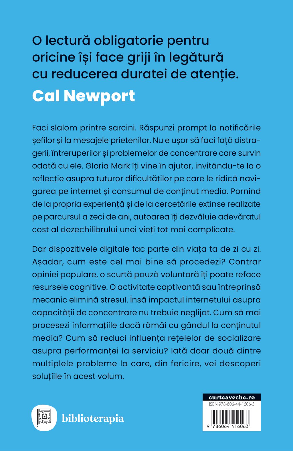 Lucrarea de față e bazată pe zeci de ani de cercetare despre efectul computerizării asupra vieții personale: cât de suprasolicitați am devenit, cum ne asumăm din ce în ce mai multe sarcini, cum suntem întrerupți în mod constant. Intervalul nostru de atenție a scăzut la 47 de secunde. Dacă vrei să afli cum să acționezi eficient în era digitală, Atenția e o lectură obligatorie.