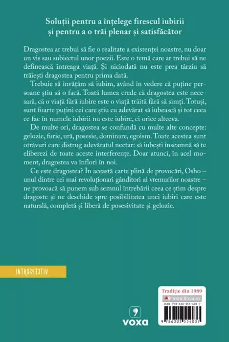 În această carte plină de provocări, Osho – unul dintre cei mai revoluționari gânditori ai vremurilor noastre – ne provoacă să punem sub semnul întrebării ceea ce știm despre dragoste și ne deschide spre posibilitatea unei iubiri care este naturală, completă și liberă de posesivitate și gelozie.