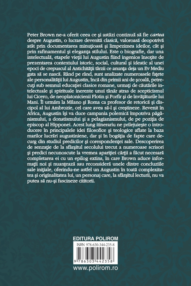 Peter Brown ne-a oferit ceea ce și astăzi continuă să fie cartea despre Augustin, o lucrare devenită clasică, valoroasă deopotrivă atât prin documentarea minuțioasă și limpezimea ideilor, cât și prin rafinamentul și eleganța stilului. Este o biografie, dar una intelectuală, etapele vieții lui Augustin fiind ingenios însoțite de prezentarea contextului istoric, social, cultural și ideatic al unei epoci de crepuscul al Antichității târzii ce anunța deja un Ev Mediu gata să se nască. Rând pe rând, sunt analizate numeroasele fațete ale personalității lui Augustin, încă din primii ani de școală, petrecuți sub semnul educației clasice romane, urmați de căutările intelectuale și spirituale inerente unui tânăr atras de scepticismul lui Cicero, de neoplatonicienii Plotin și Porfir și de învățăturile lui Mani. Îl urmăm la Milano și Roma ca profesor de retorică și discipol al lui Ambrozie, cel care avea să-l și creștineze. Revenit în Africa, Augustin își va duce campania polemică împotriva păgânismului, a donatismului și a pelagianismului, de pe poziția de episcop al Hipponei. Acest lung itinerariu ne prilejuiește o introducere în principalele idei filosofice și teologice aflate la baza marilor lucrări augustiniene, dar și în bogăția de fapte care decurg din studiul predicilor și corespondenței sale. Descoperirea de senzație de la sfârșitul secolului trecut a numeroase scrisori și predici necunoscute la vremea apariției cărții a făcut necesară completarea ei cu un epilog extins, în care Brown aduce informații noi și nuanțează sau reconsideră unele dintre concluziile sale inițiale, oferindu-ne astfel un Augustin în toată complexitatea și originalitatea lui, un personaj care, la sfârșitul lecturii, nu va putea să nu-și fascineze cititorii.