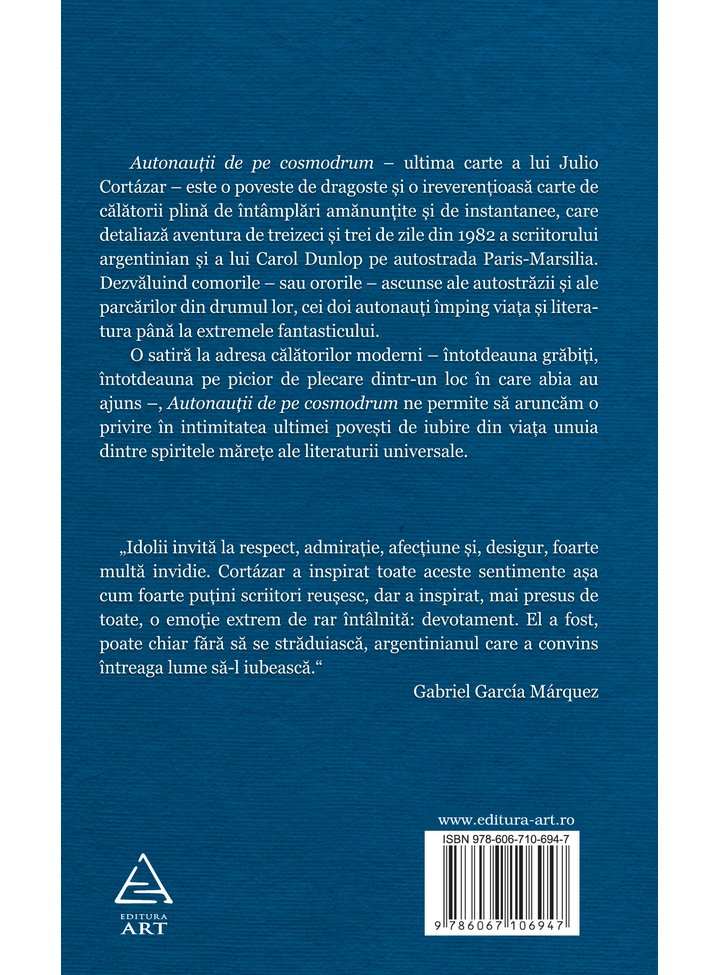 Autonauții de pe cosmodrum - ultima carte a lui Julio Cortázar - este o poveste de dragoste și o ireverențioasă carte de călătorii plină de întâmplări amănunțite și de instantanee, care detaliază aventura de treizeci și trei de zile din 1982 a scriitorului argentinian și a lui Carol Dunlop pe autostrada Paris-Marsilia. Dezvăluind comorile - sau ororile - ascunse ale autostrăzii și ale parcărilor din drumul lor, cei doi autonauți împing viața și literatura până la extremele fantasticului.