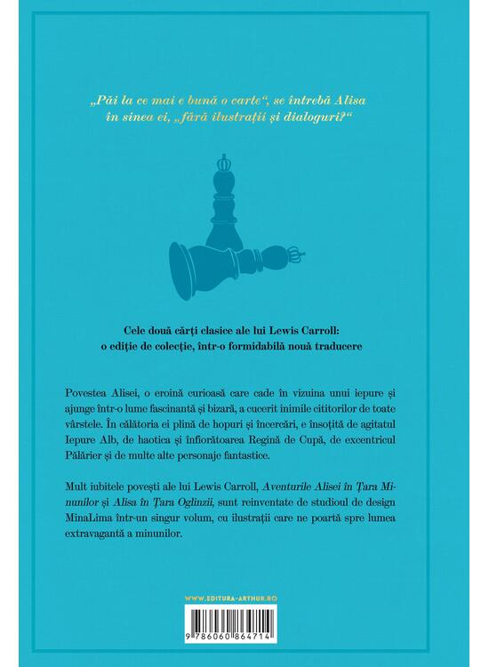 Mult iubitele povești ale lui Lewis Caroll, Aventurile Alisei în Țara Minunilor și Alisa în Țara Oglinzii, sunt reinventate de studioul de design MinaLimaîntr-un singur volum, cu ilustrații care ne poartă spre lumea extravagantă din țara minunilor.