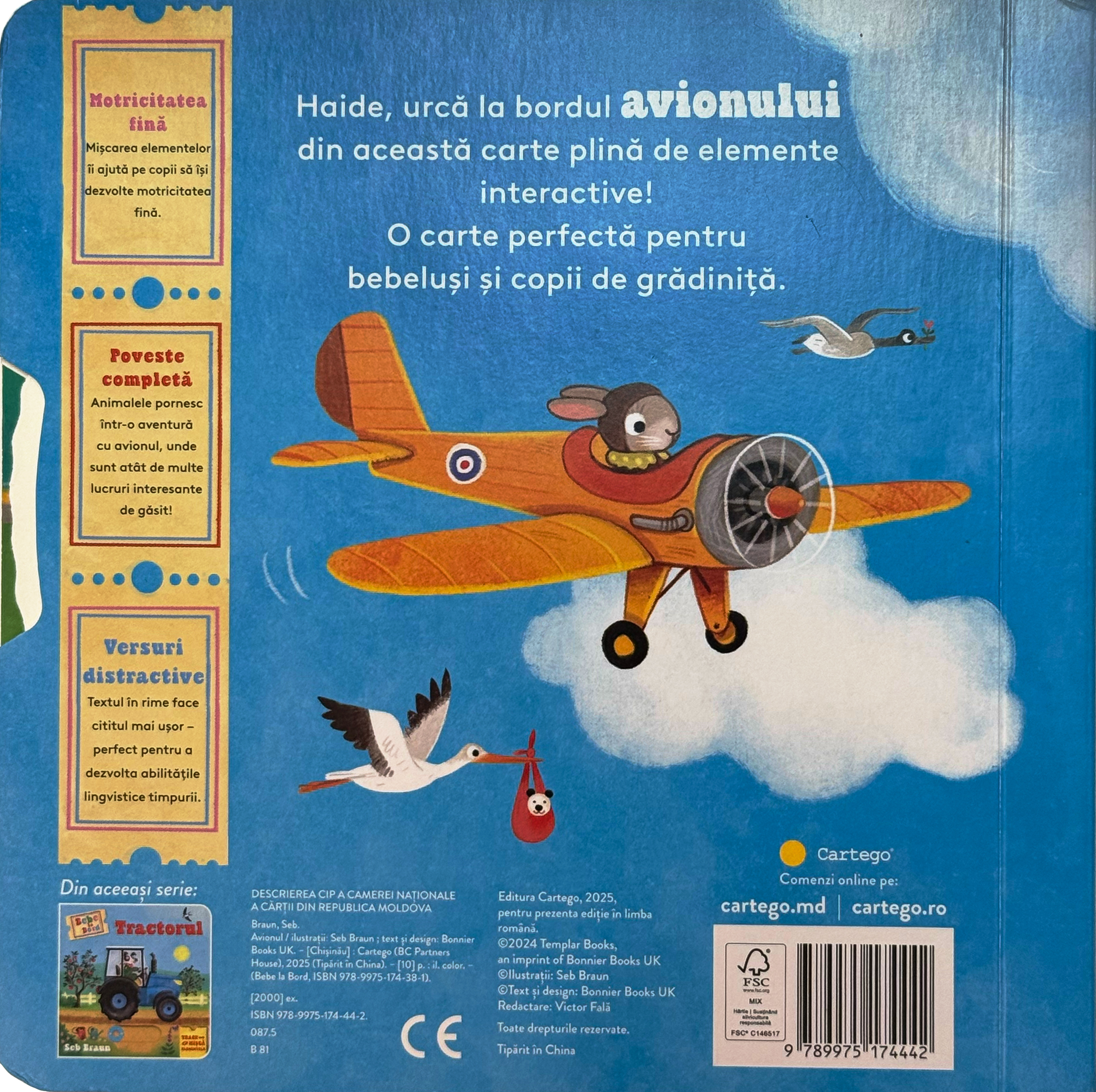 Bebe la Bord. Avionul este o carte interactivă pentru cei mai mici cititori, plină de surprize și elemente care se mișcă. Copiii descoperă pas cu pas ce se întâmplă într-o călătorie cu avionul de la îmbarcare până la aterizare. O carte, care stârnește curiozitatea și îi ajută pe cei mici să înțeleagă lumea călătoriilor prin joacă și explorare.