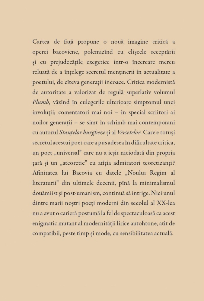 „Bacovia scrie despre sine scriind, în același timp, despre alienările, spaimele, bolile, tristețile și vulnerabilitățile fiecăruia dintre noi. Reprezentîndu-se, el ne esențializează, nu fără maliție, stările interioare declinante, le ocupă și le ia, așa-zicînd, în proprietate lirică. Le bacovianizează, de fapt, prin limbajul său repetitiv, dezarticulat, obsesional, basic. Arondabil tuturor curentelor poetice moderne și totuși ireductibil la acestea, poetul Plumbului și al Stanțelor... nu se lasă epuizat de nici o interpretare – arta sa liminală, de o simplitate înșelătoare, e o experiență insondabilă ca însăși trecerea noastră prin viață.”