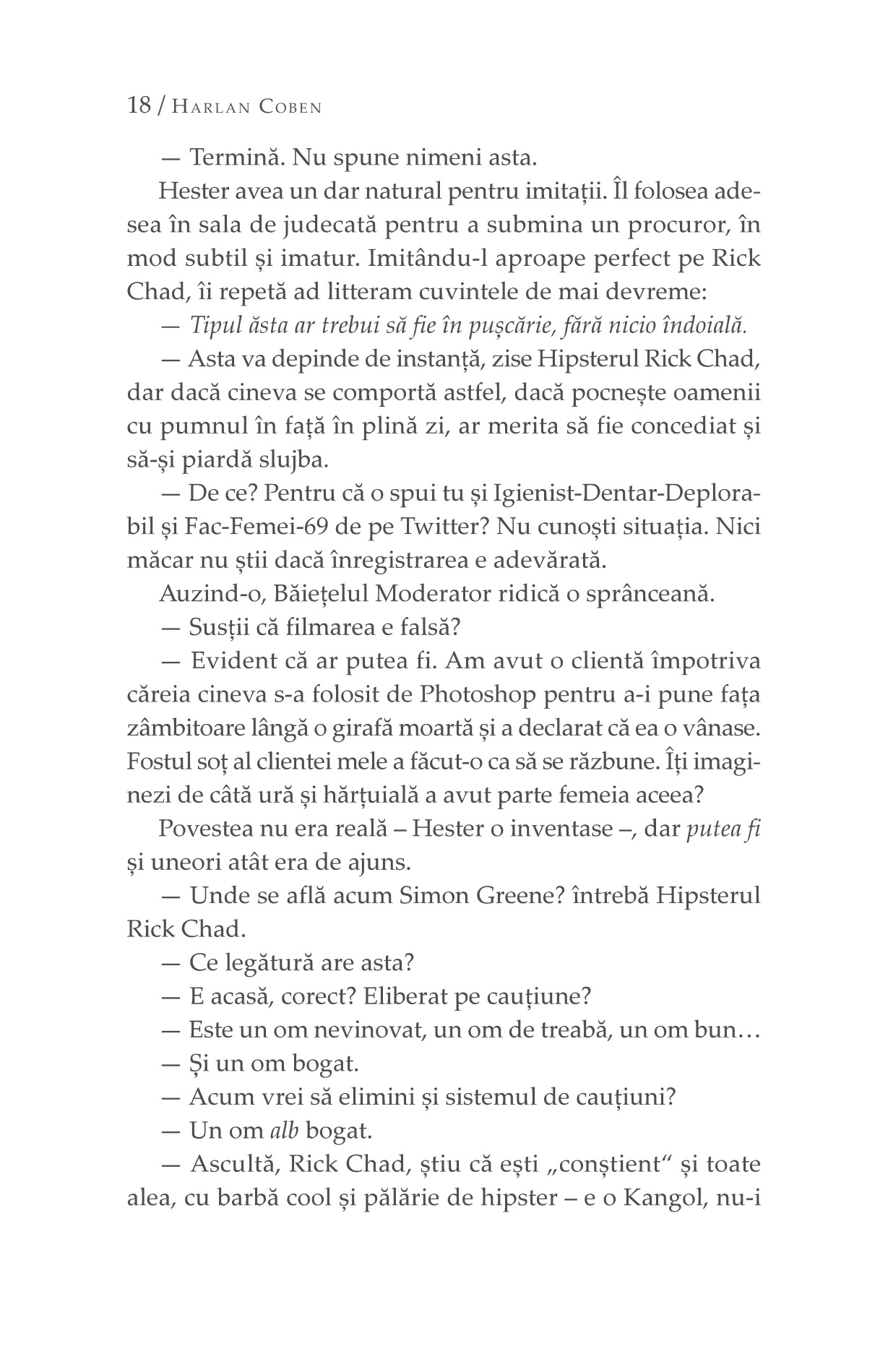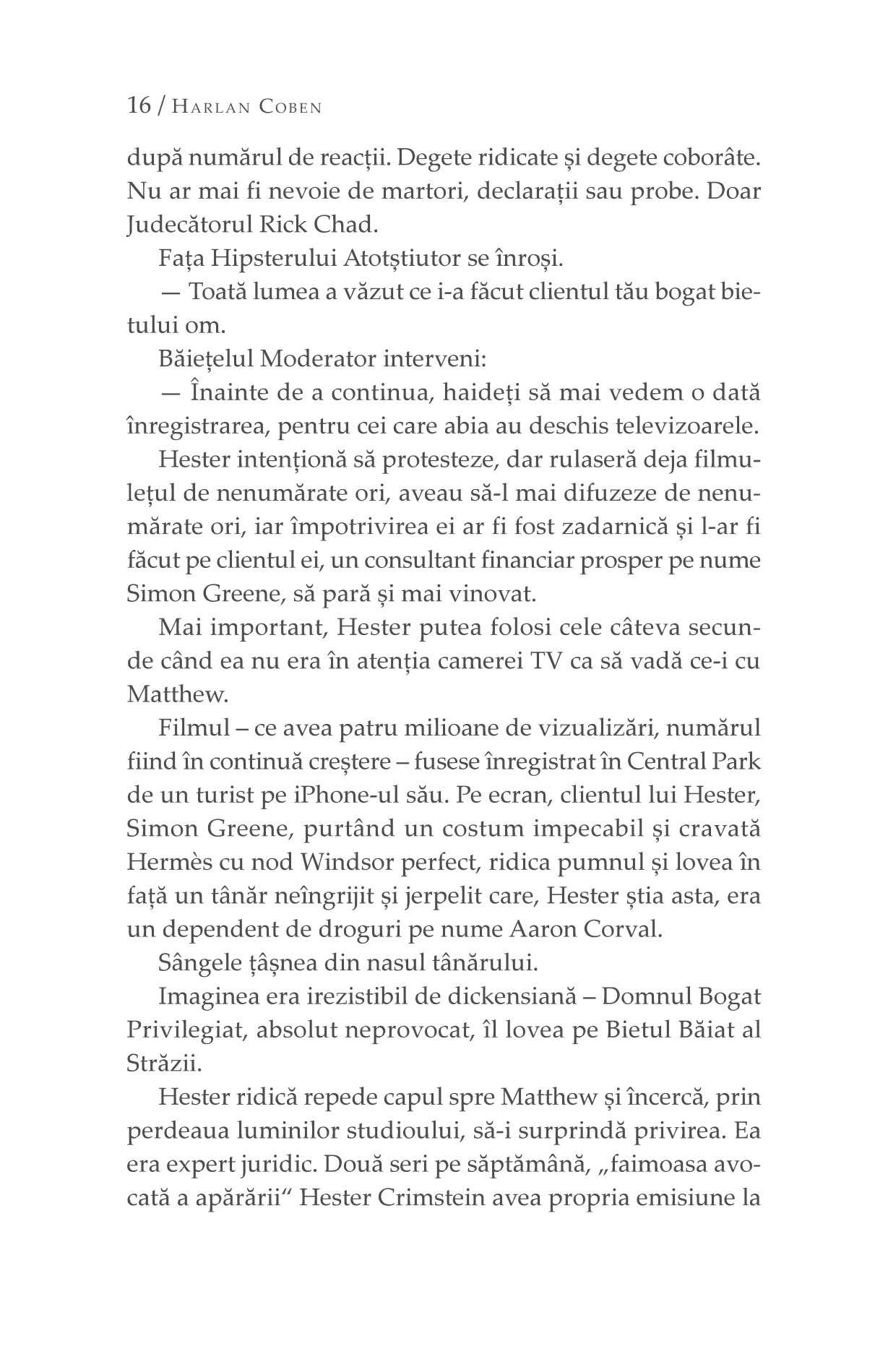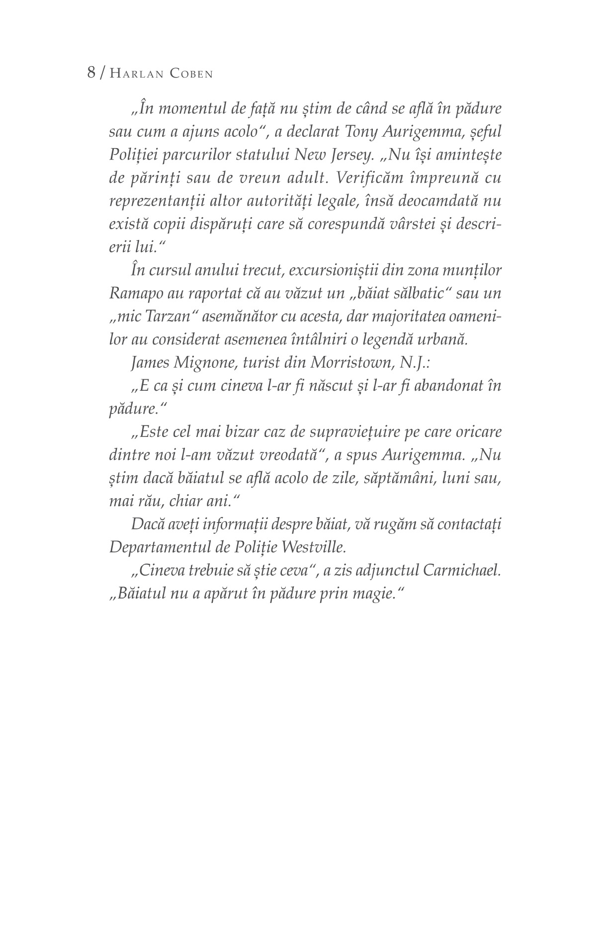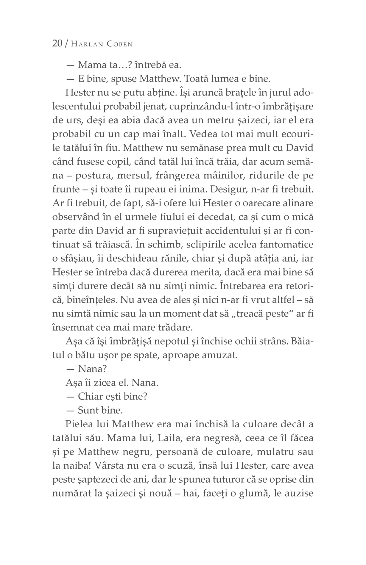 Harlan Coben (n. 1962) a început să scrie din colegiu, iar primul roman i-a fost acceptat pentru publicare la vârsta de 26 de ani, după care s-a dedicat exclusiv scrisului. A scris 33 de cărți, traduse în 45 de limbi, și a fost primul autor câștigător al tripletei de premii Edgar Award, Shamus Award și Anthony Award.