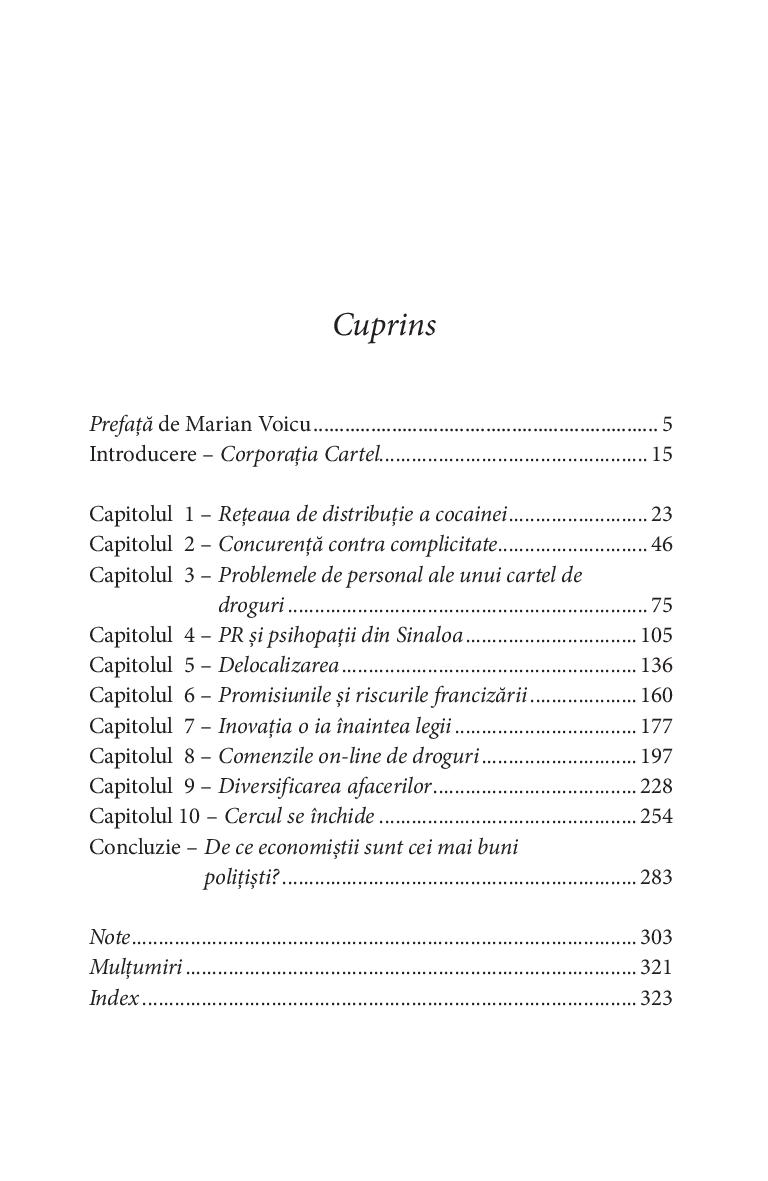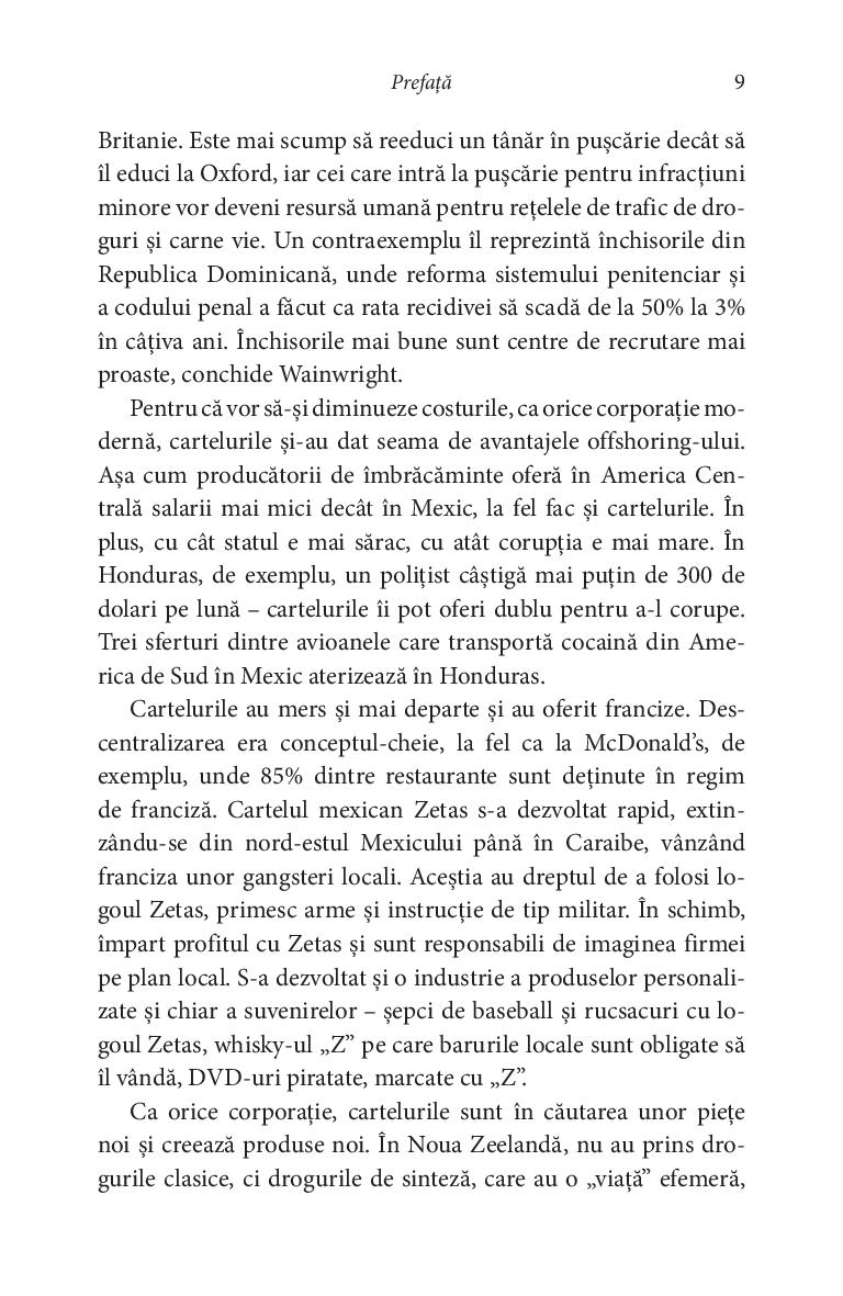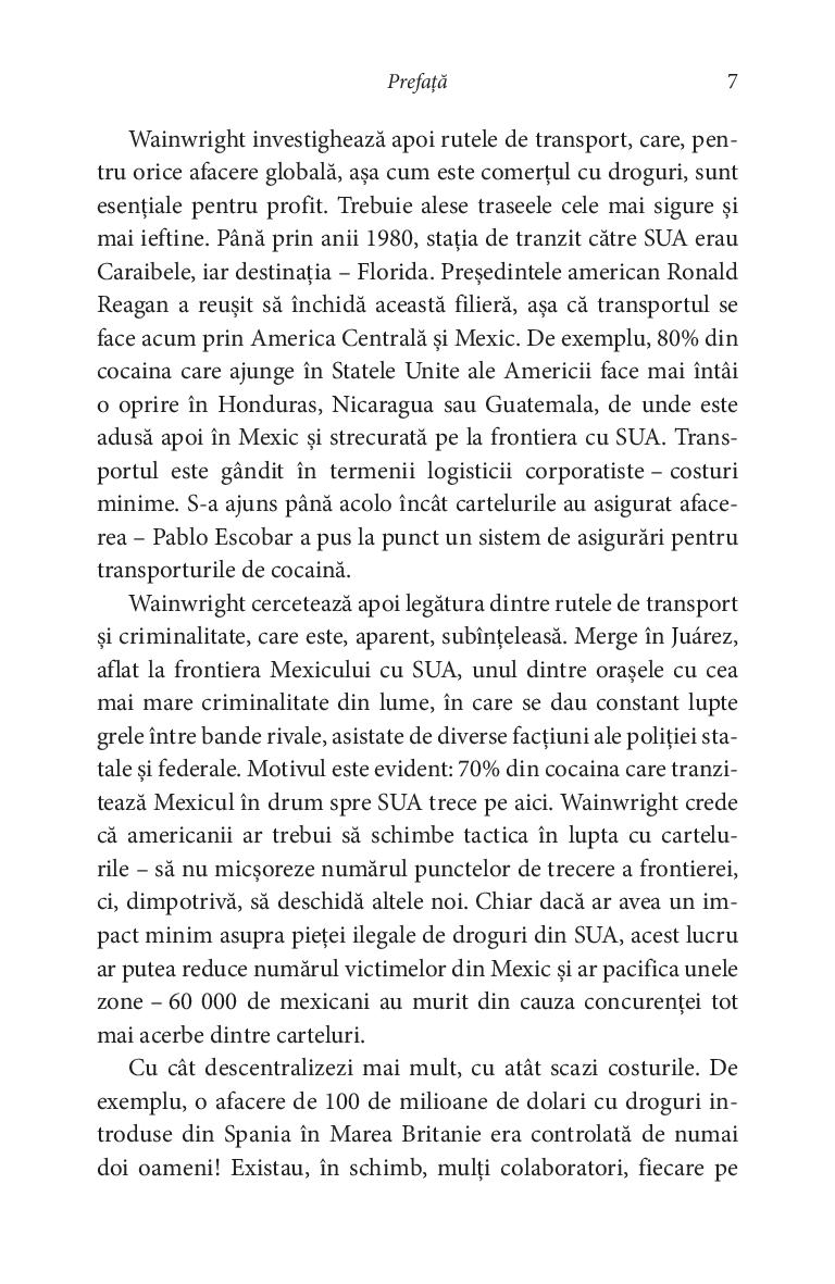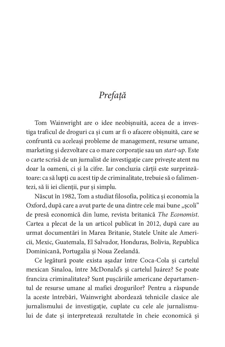 Toate strategiile și tacticile folosite de cartelurile de droguri cu scopul de a supraviețui și de a prospera pe o piață ilegală cu o cifră anuală a afacerilor de 300 de miliarde de dolari sunt, de fapt, creația unor mari corporații precum McDonald’s, Coca-Cola și Walmart. Indiferent că este vorba despre cercetare-dezvoltare, comerț electronic, resurse umane, delocalizare, concurență, relații publice sau schimbări în legislație, baronii drogurilor se lovesc de aceleași probleme ca o companie de talia lui Apple sau Ryanair. Prin urmare, când ei încep să gândească asemenea conducătorilor unor corporații, comportamentul lor nu poate fi înțeles decât cu ajutorul teoriei economice.