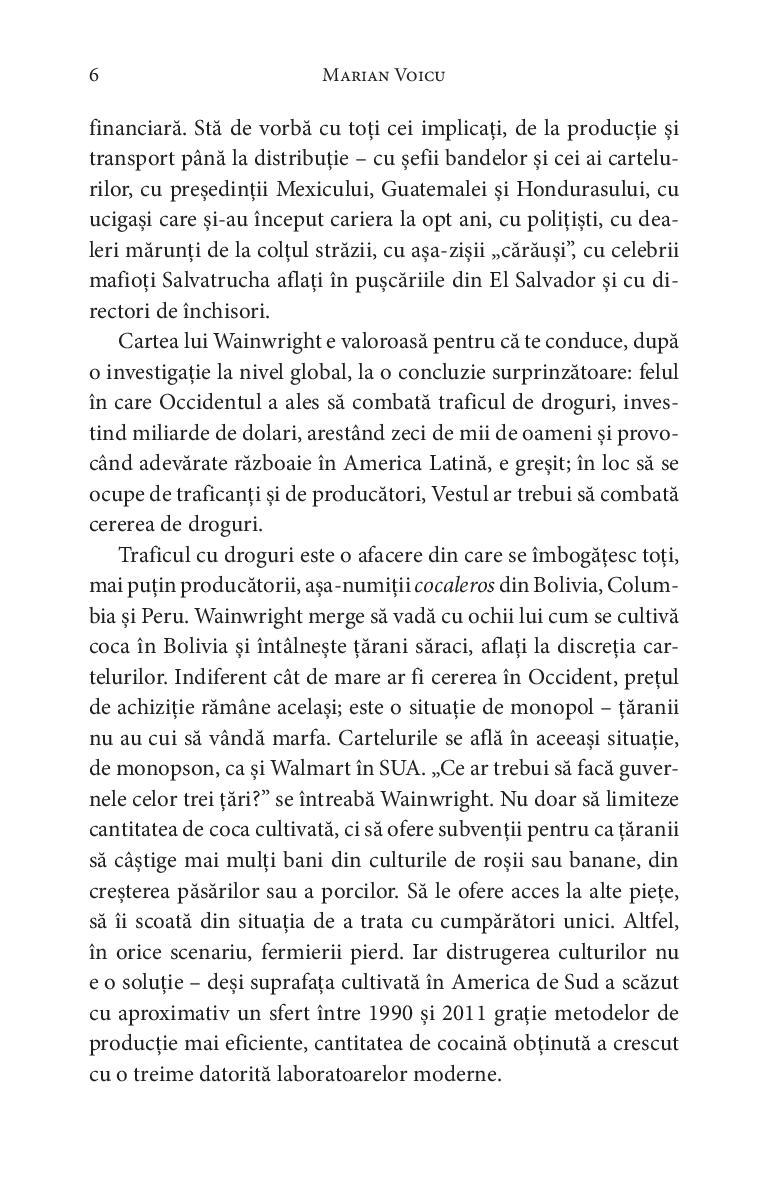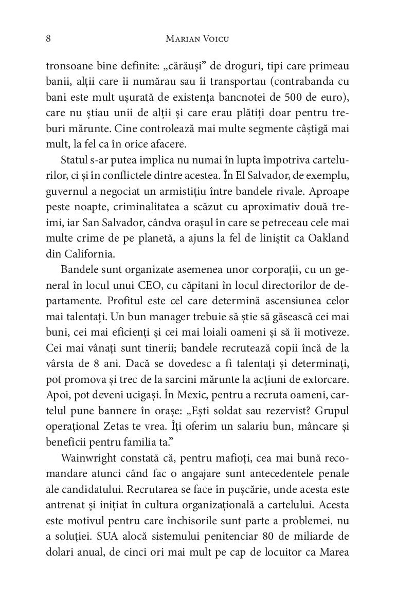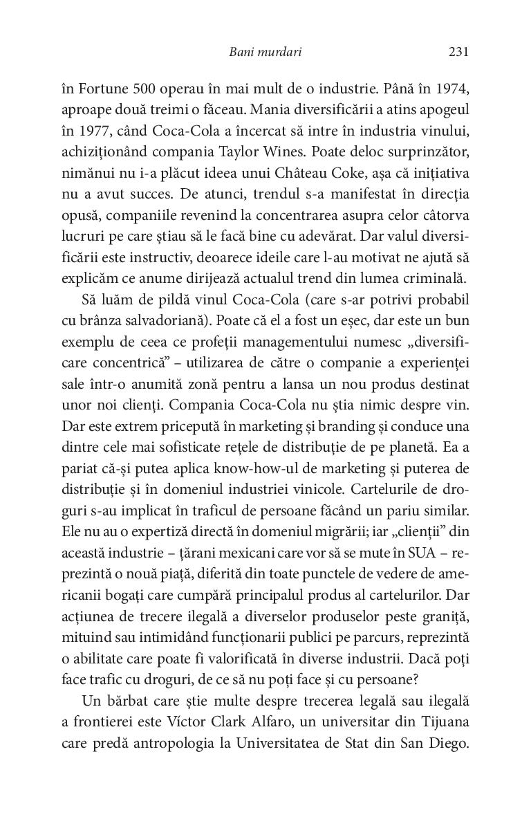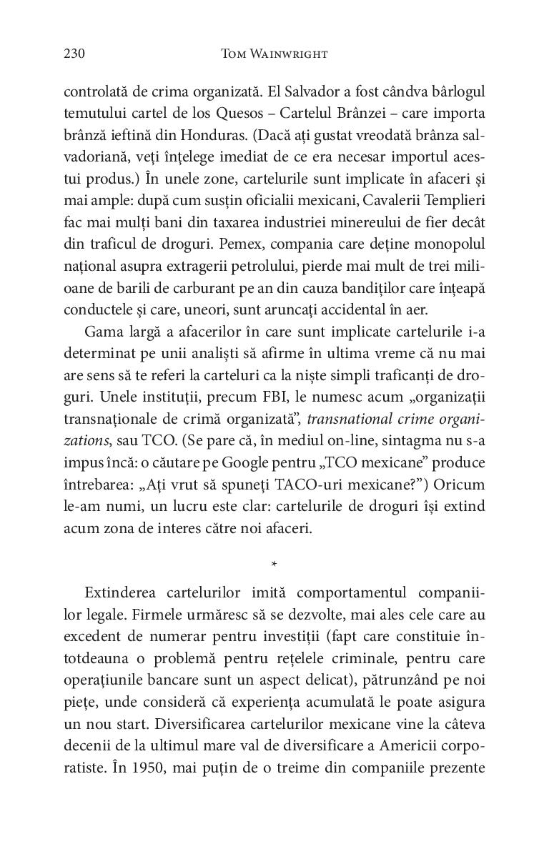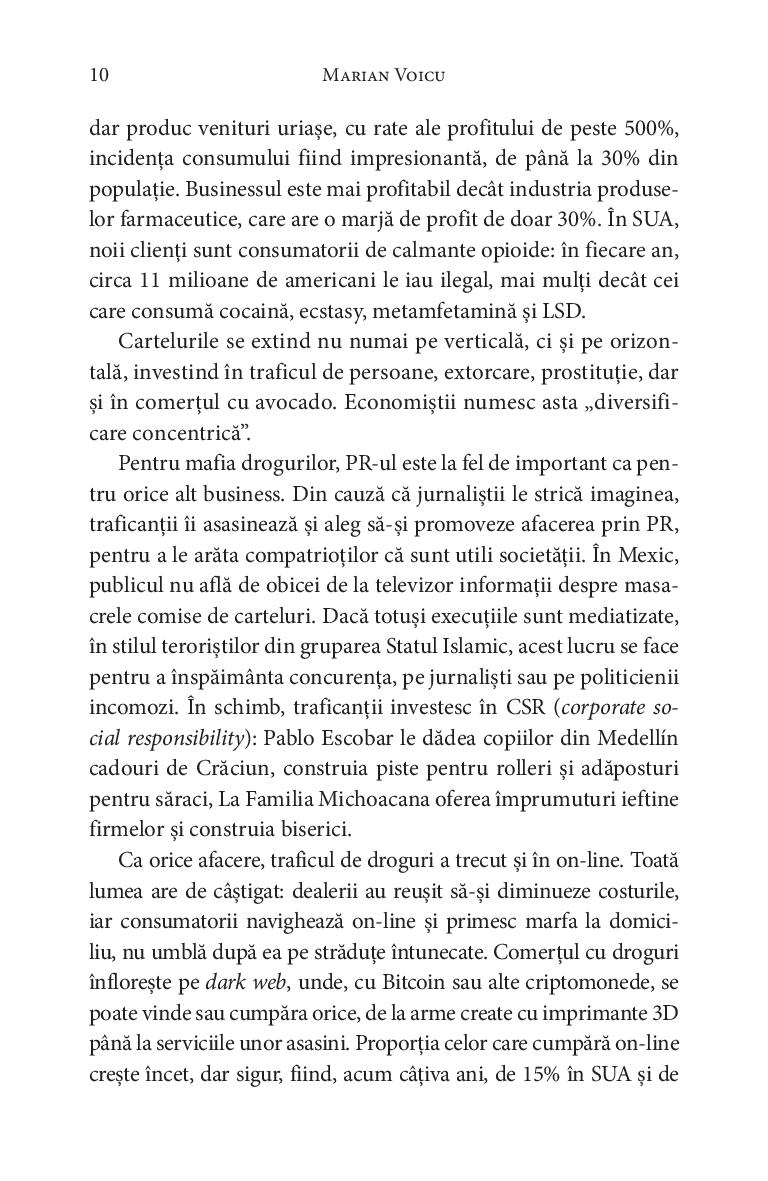 Toate strategiile și tacticile folosite de cartelurile de droguri cu scopul de a supraviețui și de a prospera pe o piață ilegală cu o cifră anuală a afacerilor de 300 de miliarde de dolari sunt, de fapt, creația unor mari corporații precum McDonald’s, Coca-Cola și Walmart. Indiferent că este vorba despre cercetare-dezvoltare, comerț electronic, resurse umane, delocalizare, concurență, relații publice sau schimbări în legislație, baronii drogurilor se lovesc de aceleași probleme ca o companie de talia lui Apple sau Ryanair. Prin urmare, când ei încep să gândească asemenea conducătorilor unor corporații, comportamentul lor nu poate fi înțeles decât cu ajutorul teoriei economice.