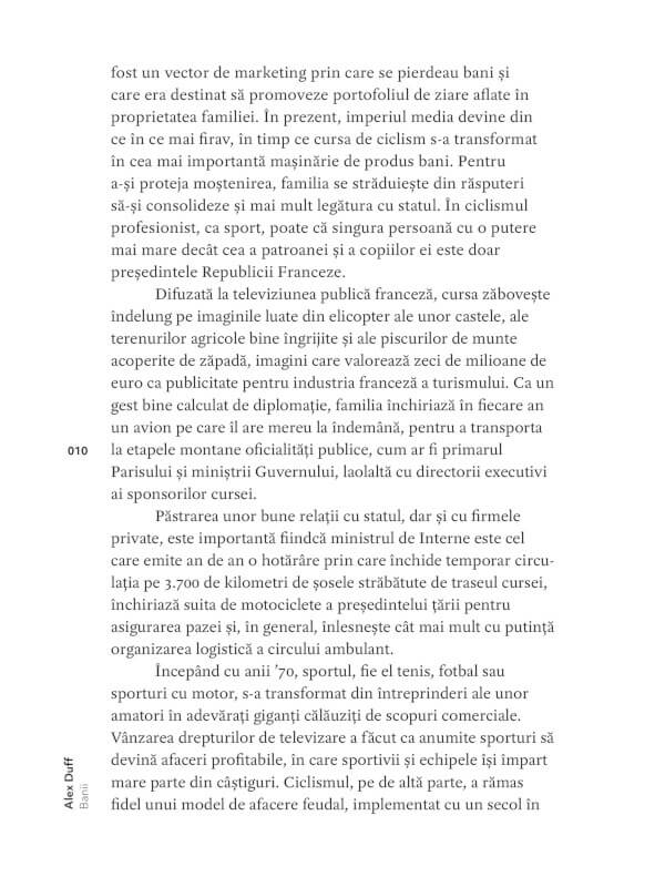 Alex Duff dezvăluie fascinanta și necunoscuta poveste a relațiilor de putere și de bani din spatele Turului Franței. Scrisă într-un ritm alert și documentată cu meticulozitate, BANII este plină de povești aproape la fel de fascinante ca bătăliile purtate pe traseu pentru tricoul galben.