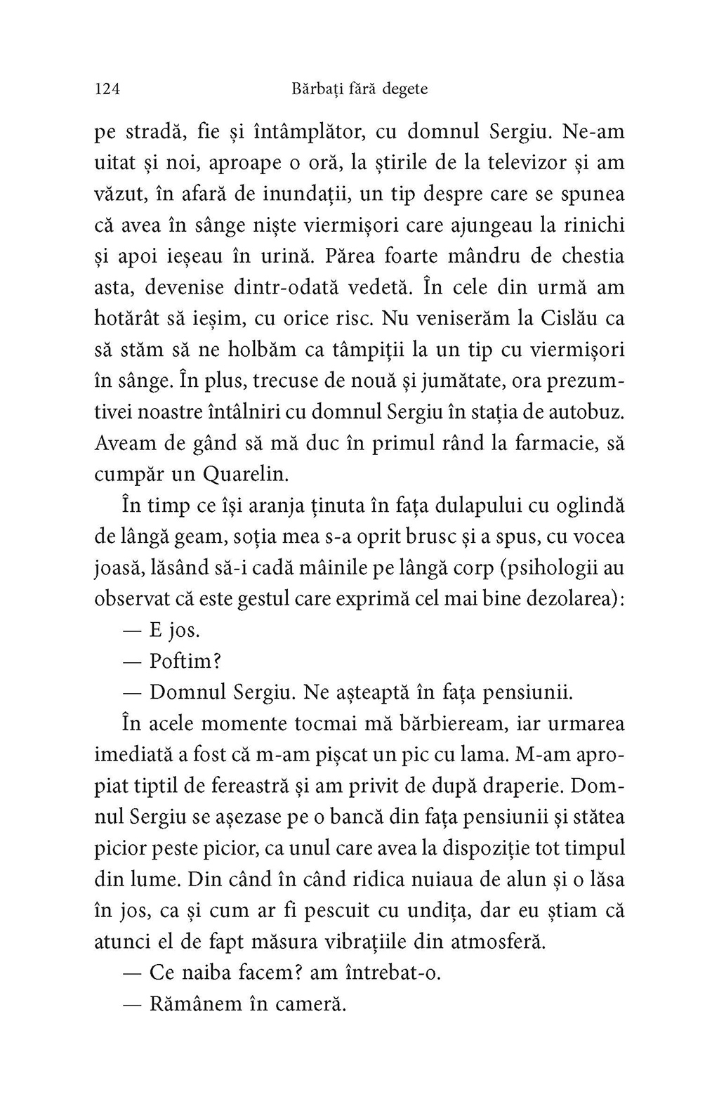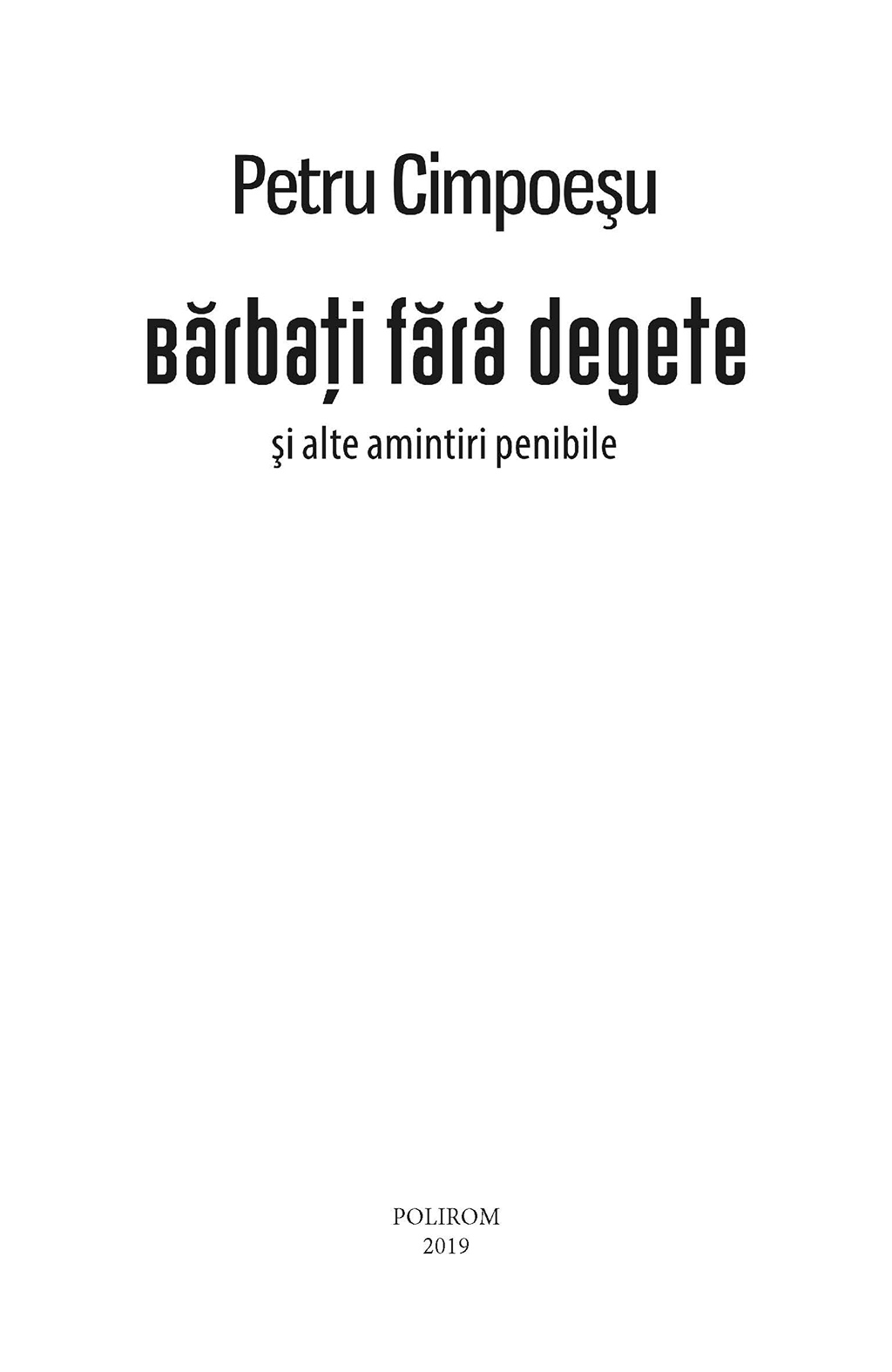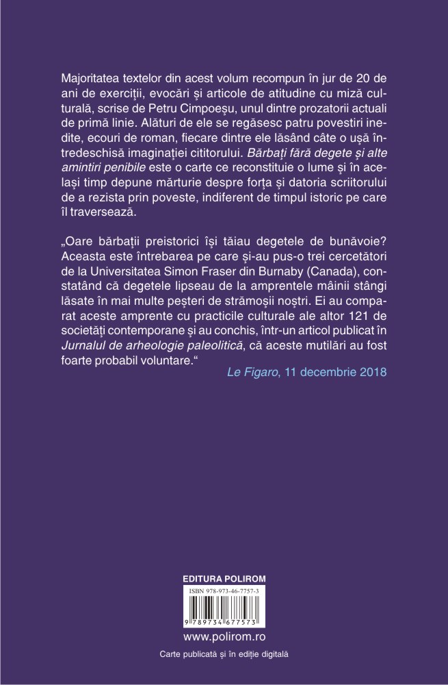 Majoritatea textelor din acest volum recompun în jur de 20 de ani de exerciții, evocări și articole de atitudine cu miză culturală, scrise de Petru Cimpoeşu, unul dintre prozatorii actuali de primă linie. Alături de ele se regăsesc patru povestiri inedite, ecouri de roman, fiecare dintre ele lăsînd cîte o ușă întredeschisă imaginației cititorului. Bărbați fără degete şi alte amintiri penibile este o carte ce reconstituie o lume și în același timp depune mărturie despre forța și datoria scriitorului de a rezista prin poveste, indiferent de timpul istoric pe care îl traversează.