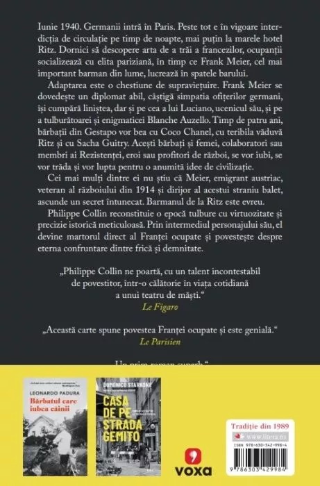 Cei mai mulți dintre ei nu știu că Meier, emigrant austriac, veteran al războiului din 1914 și dirijor al acestui straniu balet, ascunde un secret întunecat. Barmanul de la Ritz este evreu. Philippe Collin reconstituie o epocă tulbure cu virtuozitate și precizie istorică meticuloasă. Prin intermediul personajului său, el devine martorul direct al Franței ocupate și povestește despre eterna confruntare dintre frică și demnitate.