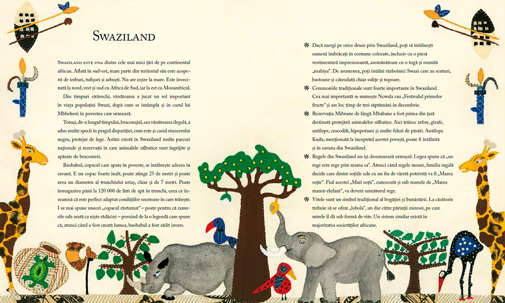 IN AFRICA se spun povești din cele mai vechi timpuri. Popoarele africane vorbesc peste o mie de limbi – mai multe decât pe oricare alt continent. Înțelepciunea populară s-a transmis de la om la om și din ea s-au născut multe povești care se mai spun și astăzi. În ele găsim explicații pentru orice – de la cum au fost create lucrurile până la de ce vânează bufnițele noaptea. În Africa și peste tot în lume, poveștile trăiesc numai dacă sunt spuse mereu și mereu. Ce-ar fi să te alături și tu, cititorule, tradiției africane de a spune povești pentru a le da mai departe? E de ajuns să deschizi cartea și vei începe o călătorie de neuitat prin acest continent extraordinar care este Africa. (GCINA MHLOPHE, autoare)