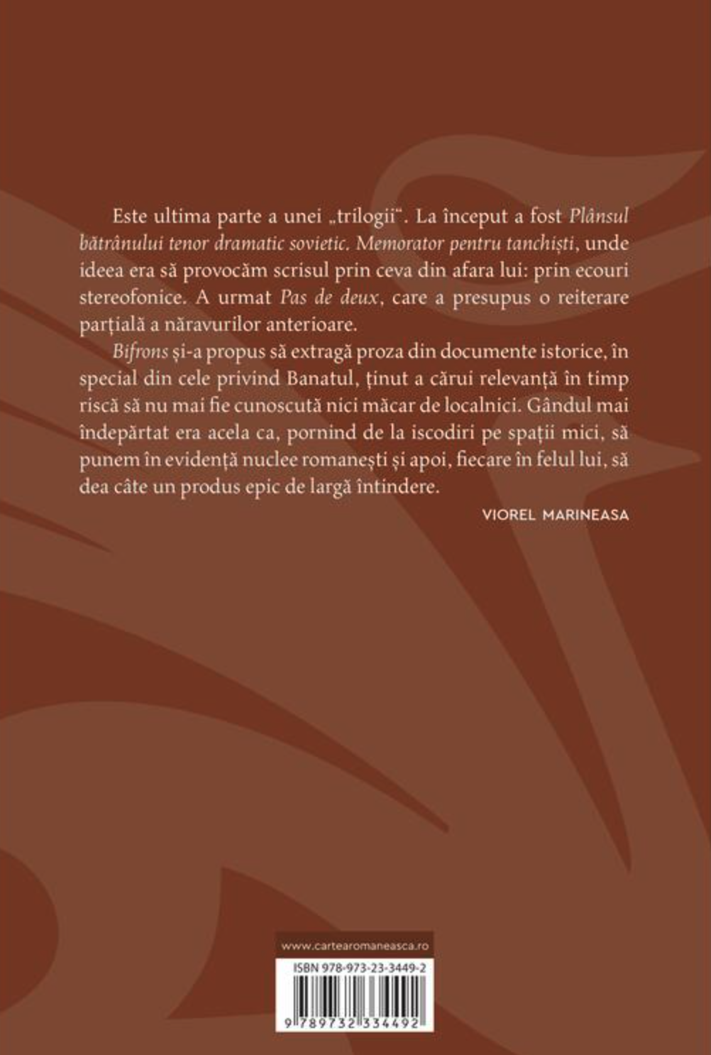 Bifrons şi-a propus să extragă proza din documente istorice, în special din cele privind Banatul, ținut a cărui relevanță în timp riscă să nu mai fie cunoscută nici măcar de localnici. Gândul mai îndepărtat era acela ca, pornind de la iscodiri pe spații mici, să punem în evidență nuclee romanești și apoi, fiecare în felul lui, să dea câte un produs epic de largă întindere. -- VIOREL MARINEASA