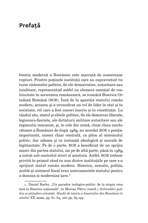 Ca istoric, am ales, firește, o abordare istoriografică mai degrabă decât teologică și am urmărit Biserica Ortodoxă Română în contextul dezvoltării statului român și a societății românești de la 1918 încoace. E o carte care se referă la BOR ca instituție, care urmărește detaliile împletirii dintre BOR și politică și înfățișează luptele pentru putere din Biserică. Accentul cade în aceste pagini pe relașia Biserică–stat–națiune, pe analiza acestei legături care continuă să exercite o influență însemnată asupra țării și a cetățenilor săi.“ — OLIVER JENS SCHMITT