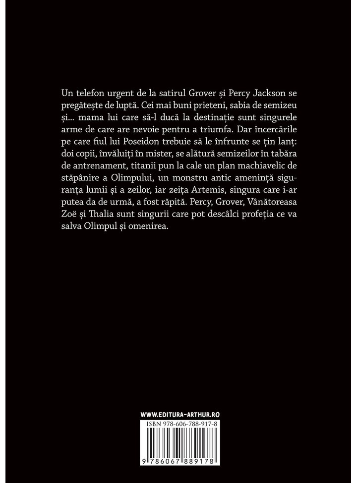Cei mai buni prieteni, sabia de semizeu şi... mama lui care să-l ducă la destinaţie sunt singurele arme de care are nevoie pentru a triumfa. Dar încercările pe care fiul lui Poseidon trebuie să le înfrunte se ţin lanţ: doi copii, învăluiţi în mister, se alătură semizeilor în tabăra de antrenament, titanii pun la cale un plan machiavelic de stăpânire a Olimpului, un monstru antic ameninţă siguranţa lumii şi a zeilor, iar zeiţa Artemis, singura care i-ar putea da de urmă, a fost răpită. Percy, Grover, Vânătoreasa Zoë şi Thalia sunt singurii care pot descâlci profeţia ce va salva Olimpul şi omenirea.