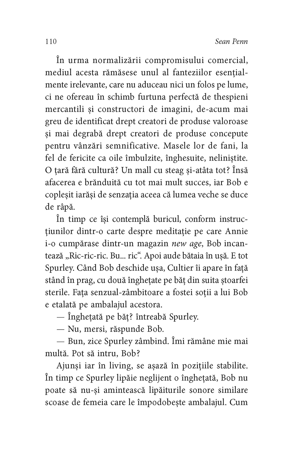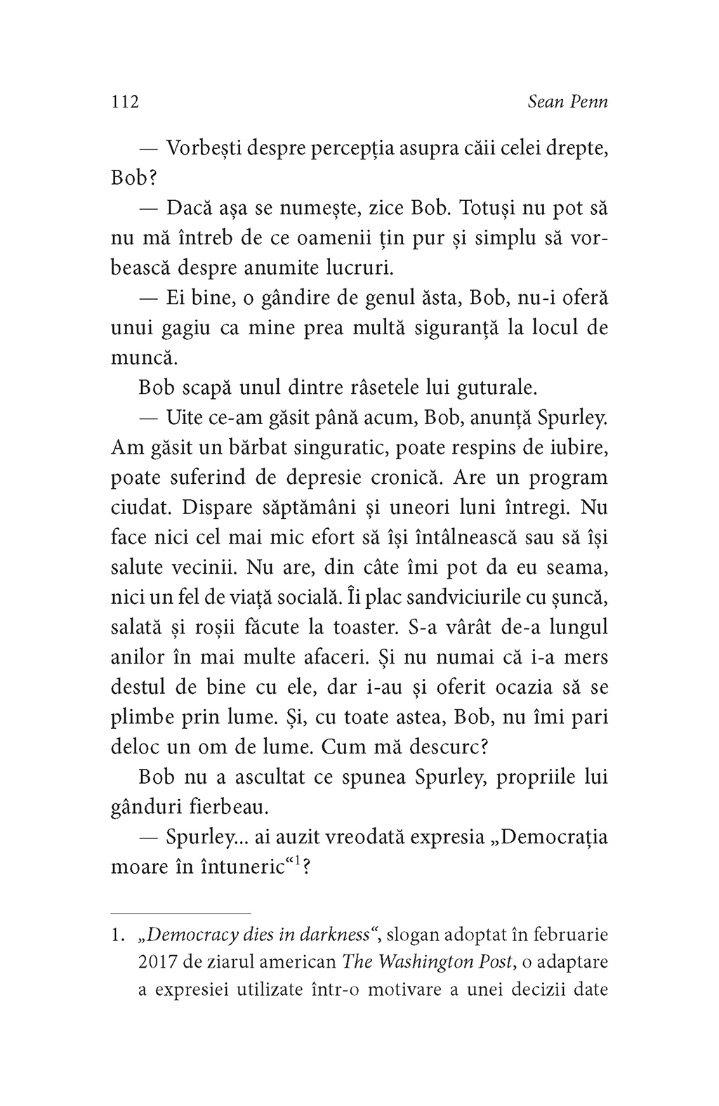 Sean Penn (n. 1960) este un celebru actor, regizor şi prozator american. Născut în California, la Santa Monica, a studiat la liceul local şi foarte devreme şi-a făcut debutul în cinematografie. A lucrat ca actor, scenarist, producător şi regizor, fiind implicat în peste o sută de producţii de teatru şi film. În lunga sa activitate, a obţinut de două ori premiul Oscar pentru rolurile din Misterele fluviului (2003) şi Milk (2008) şi a mai fost nominalizat de cîteva ori pentru rolurile jucate în alte filme. Sean Penn s-a implicat activ şi în viaţa socială şi politică a Statelor Unite. Critic dur al preşedintelui George W. Bush şi, mai apoi, al preşedintelui Donald Trump, a publicat o serie de texte jurnalistice în San Francisco Chronicle, The Nation şi The Huffington Post. A debutat ca prozator în 2018, cu romanul Bob Honey Who Just Do Stuff (Bob Honey care face şi drege). În 2019 i-a apărut al doilea roman, intitulat Bob Honey Sings Jimmy Crack Corn.