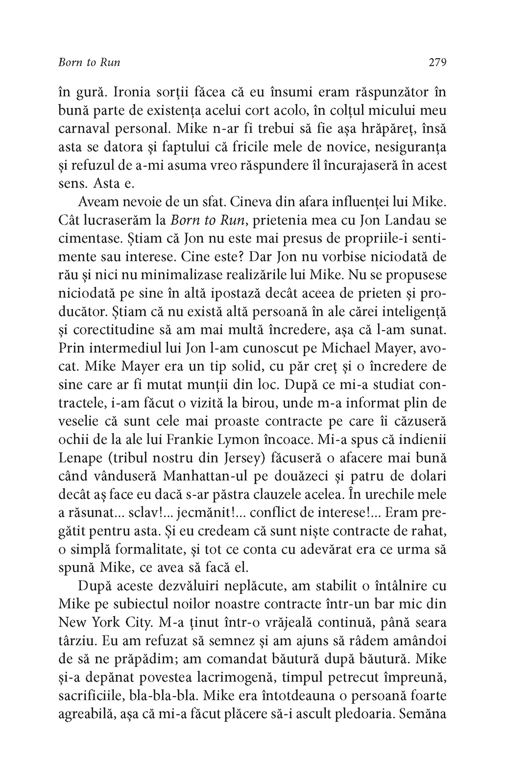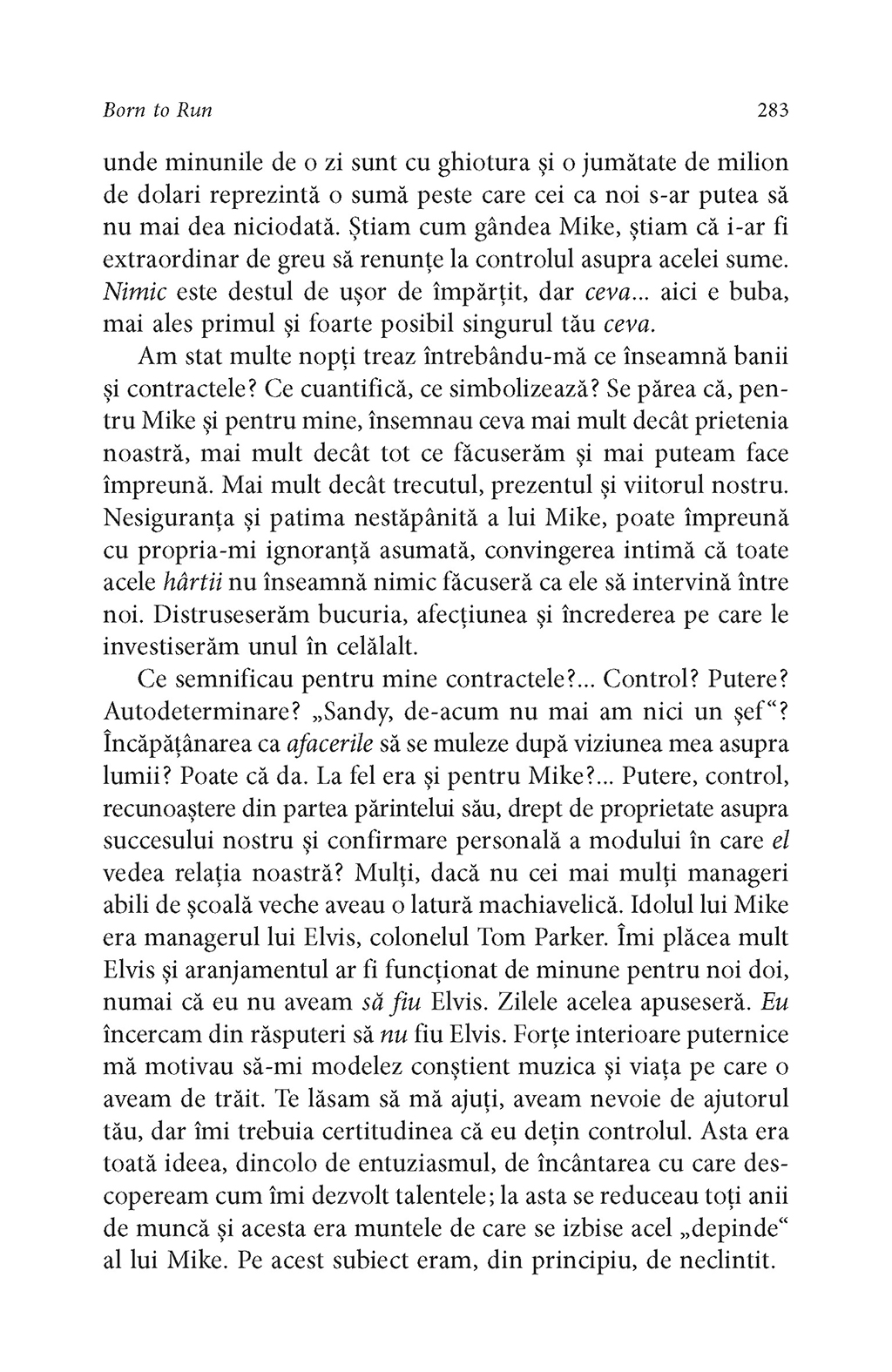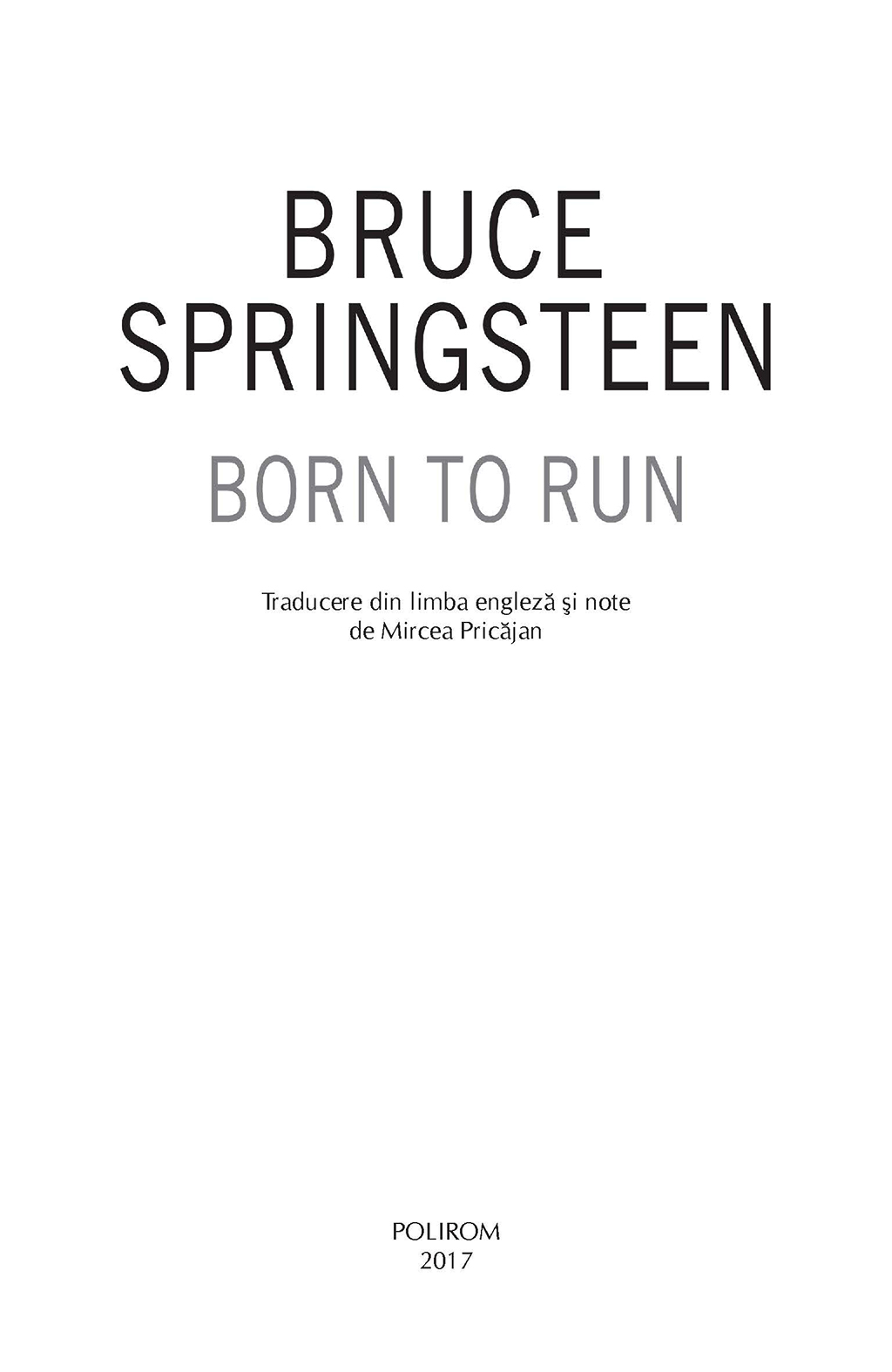 Rareori un artist şi-a istorisit viaţa cu atît de mult talent narativ şi forţă evocatoare. La fel ca în cîntecele sale („Thunder Road”, „Badlands”, „Darkness on the Edge of Town”, „The River”, „Born in the USA”, „The Rising”, „The Ghost of Tom Joad”, pentru a aminti doar cîteva), în autobiografia lui Bruce Springsteen găsim acea doză de lirism care l-a consacrat pe scena muzicală a lumii, dar şi înţelepciunea unui om care a ştiut să reflecteze profund la experienţele prin care a trecut în viaţă. În Born to Run, Bruce Springsteen povesteşte cum a crescut într-un mediu religios, în Freehold, New Jersey, înconjurat de poezia, pericolele şi întunericul care i-au stimulat apoi imaginaţia, ajungînd la momentul marii revelaţii: debutul lui Elvis Presley la The Ed Sullivan Show. Cantautorul evocă într-o manieră surprinzătoare dorinţa sa de a deveni muzician, începuturile ca rege al formaţiilor de bar din Asbury Park şi înfiinţarea E Street Band. Cu o candoare dezarmantă, Bruce Springsteen spune pentru prima dată povestea frămîntărilor personale care i-au inspirat cele mai bune compoziţii muzicale.