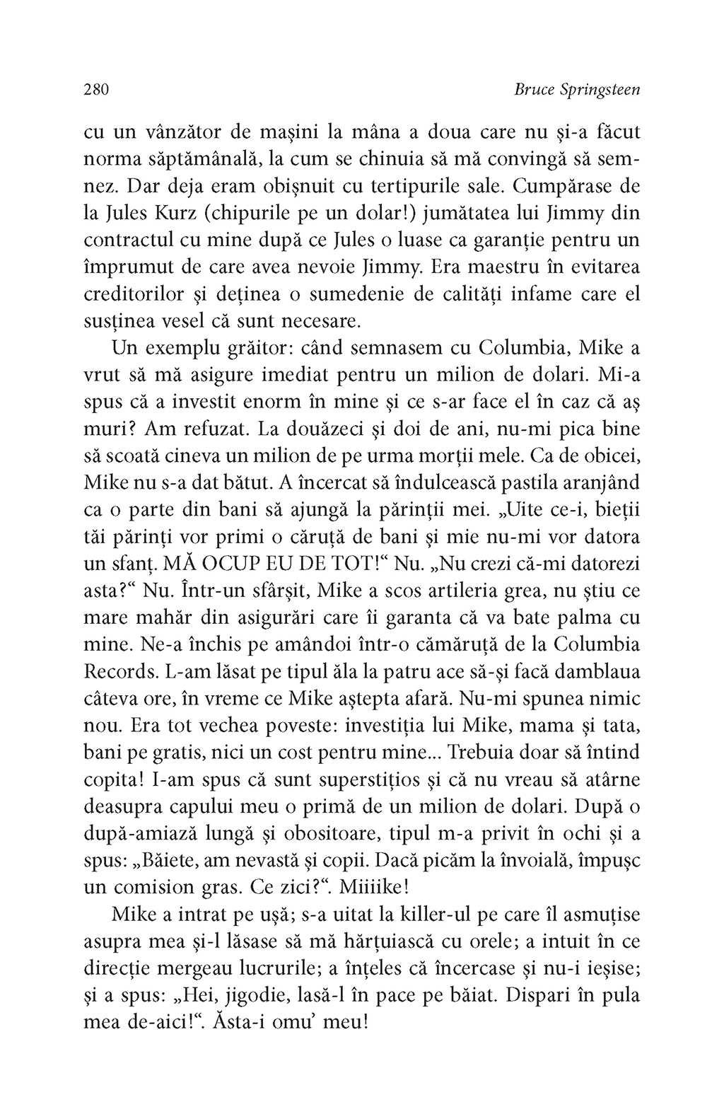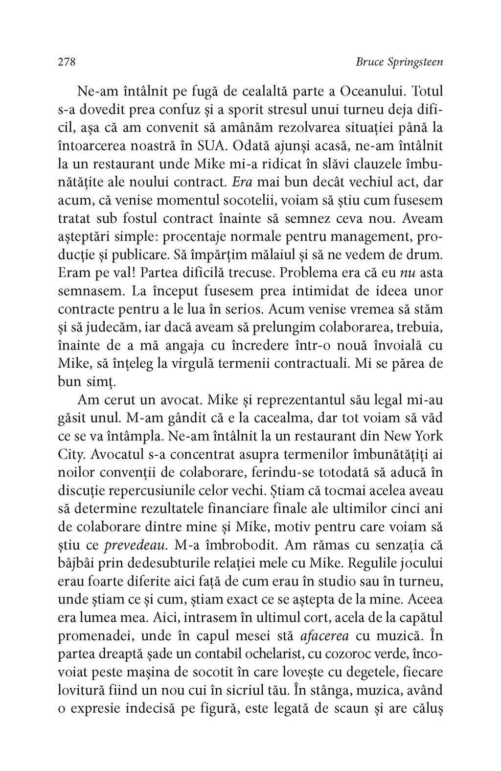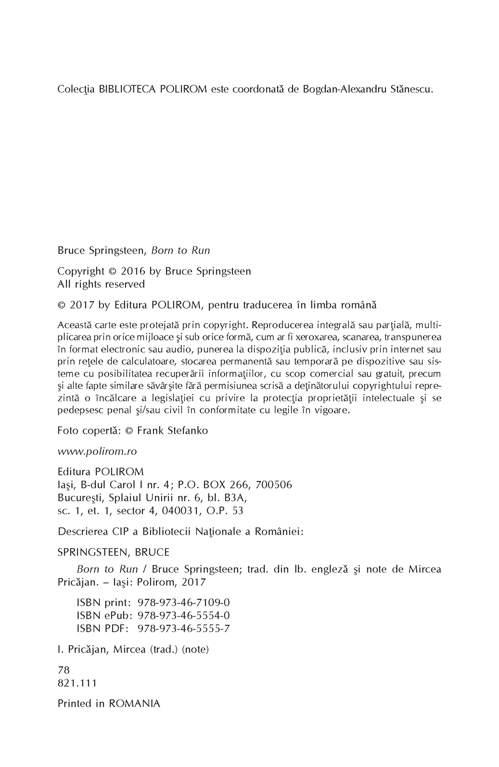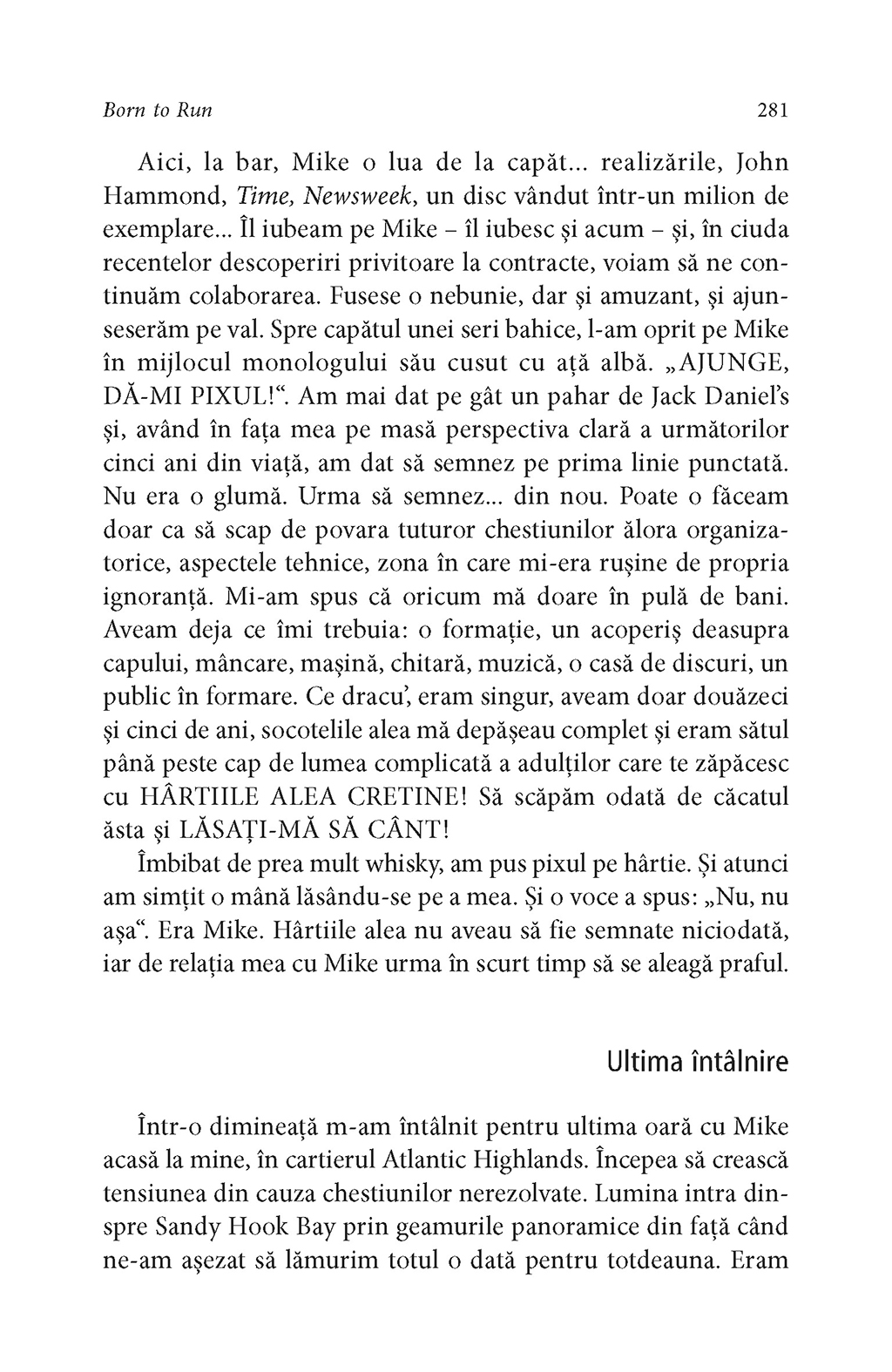 Rareori un artist şi-a istorisit viaţa cu atît de mult talent narativ şi forţă evocatoare. La fel ca în cîntecele sale („Thunder Road”, „Badlands”, „Darkness on the Edge of Town”, „The River”, „Born in the USA”, „The Rising”, „The Ghost of Tom Joad”, pentru a aminti doar cîteva), în autobiografia lui Bruce Springsteen găsim acea doză de lirism care l-a consacrat pe scena muzicală a lumii, dar şi înţelepciunea unui om care a ştiut să reflecteze profund la experienţele prin care a trecut în viaţă. În Born to Run, Bruce Springsteen povesteşte cum a crescut într-un mediu religios, în Freehold, New Jersey, înconjurat de poezia, pericolele şi întunericul care i-au stimulat apoi imaginaţia, ajungînd la momentul marii revelaţii: debutul lui Elvis Presley la The Ed Sullivan Show. Cantautorul evocă într-o manieră surprinzătoare dorinţa sa de a deveni muzician, începuturile ca rege al formaţiilor de bar din Asbury Park şi înfiinţarea E Street Band. Cu o candoare dezarmantă, Bruce Springsteen spune pentru prima dată povestea frămîntărilor personale care i-au inspirat cele mai bune compoziţii muzicale.
