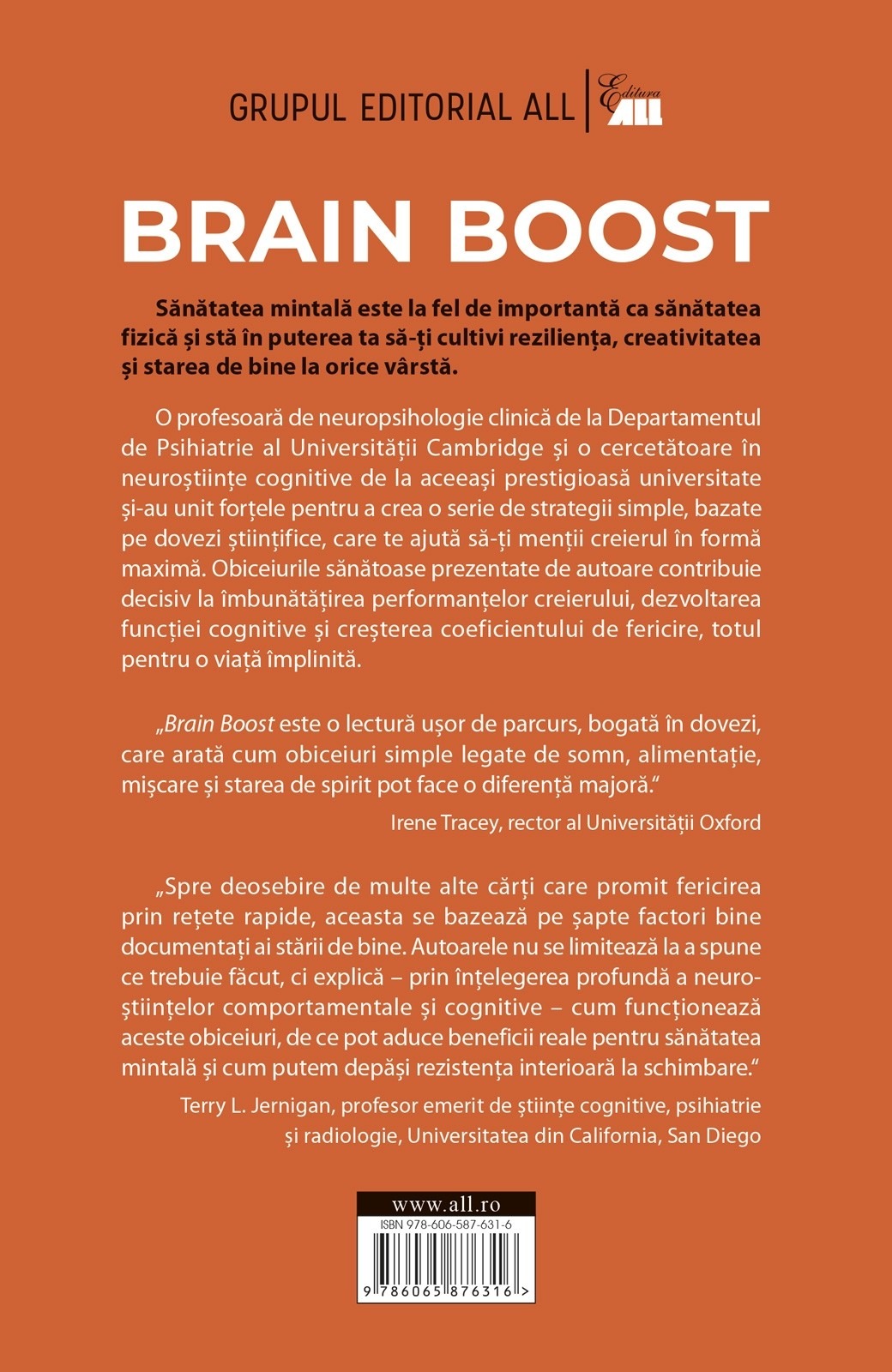 „Brain Boost este o lectură ușor de parcurs, bogată în dovezi, care arată cum obiceiuri simple legate de somn, alimentație, mișcare și starea de spirit pot face o diferență majoră.“ – Irene Tracey, rector al Universității Oxford