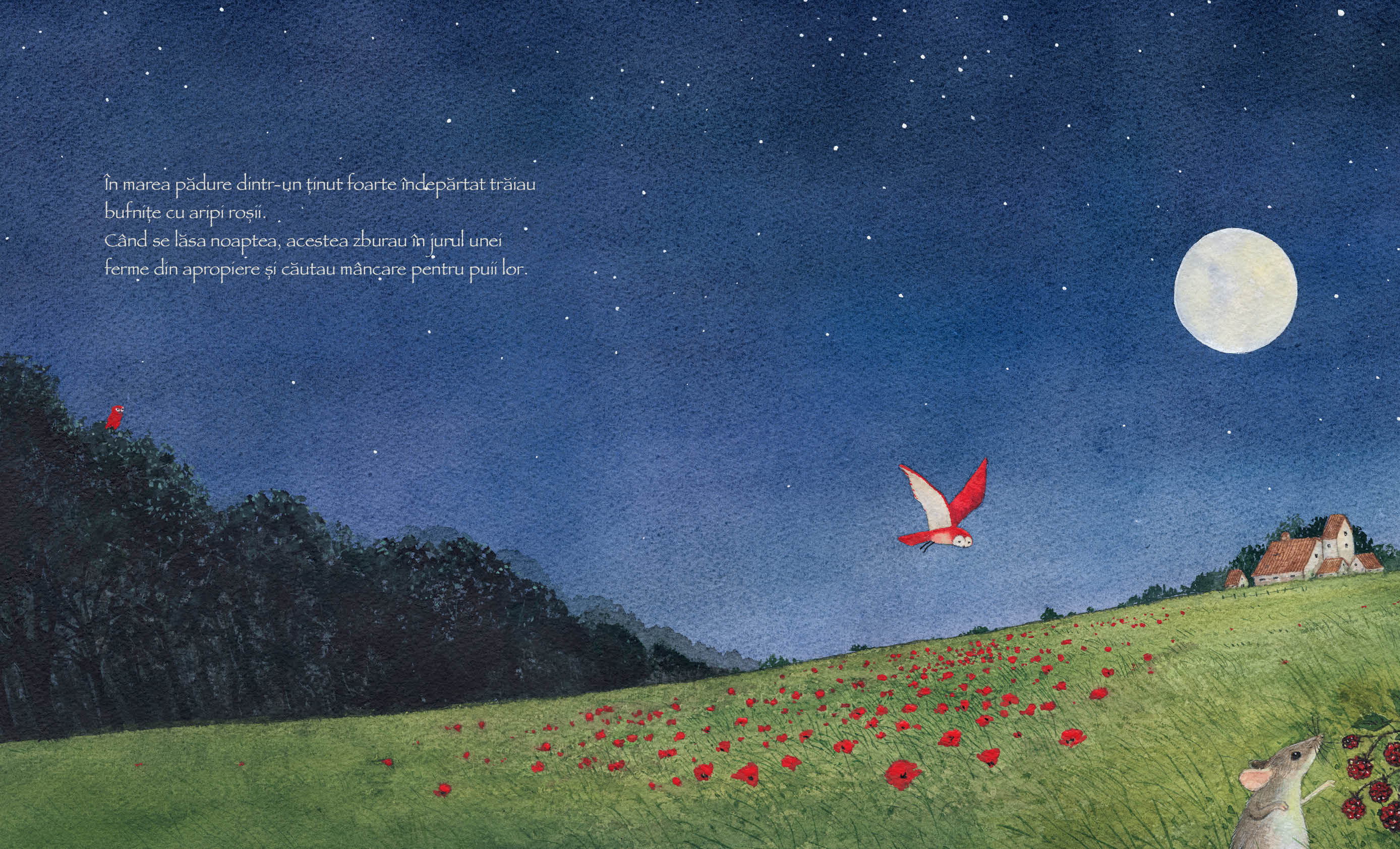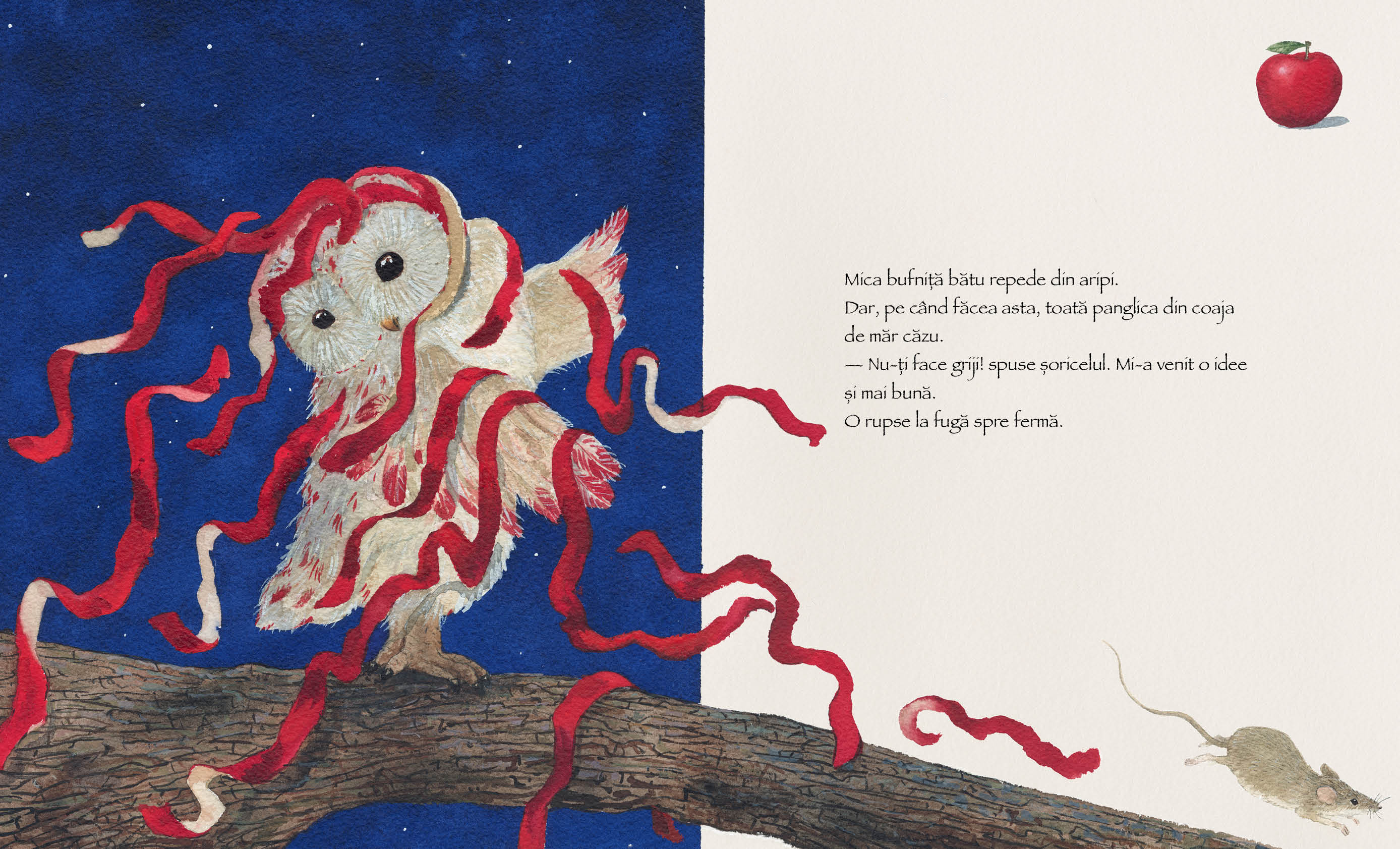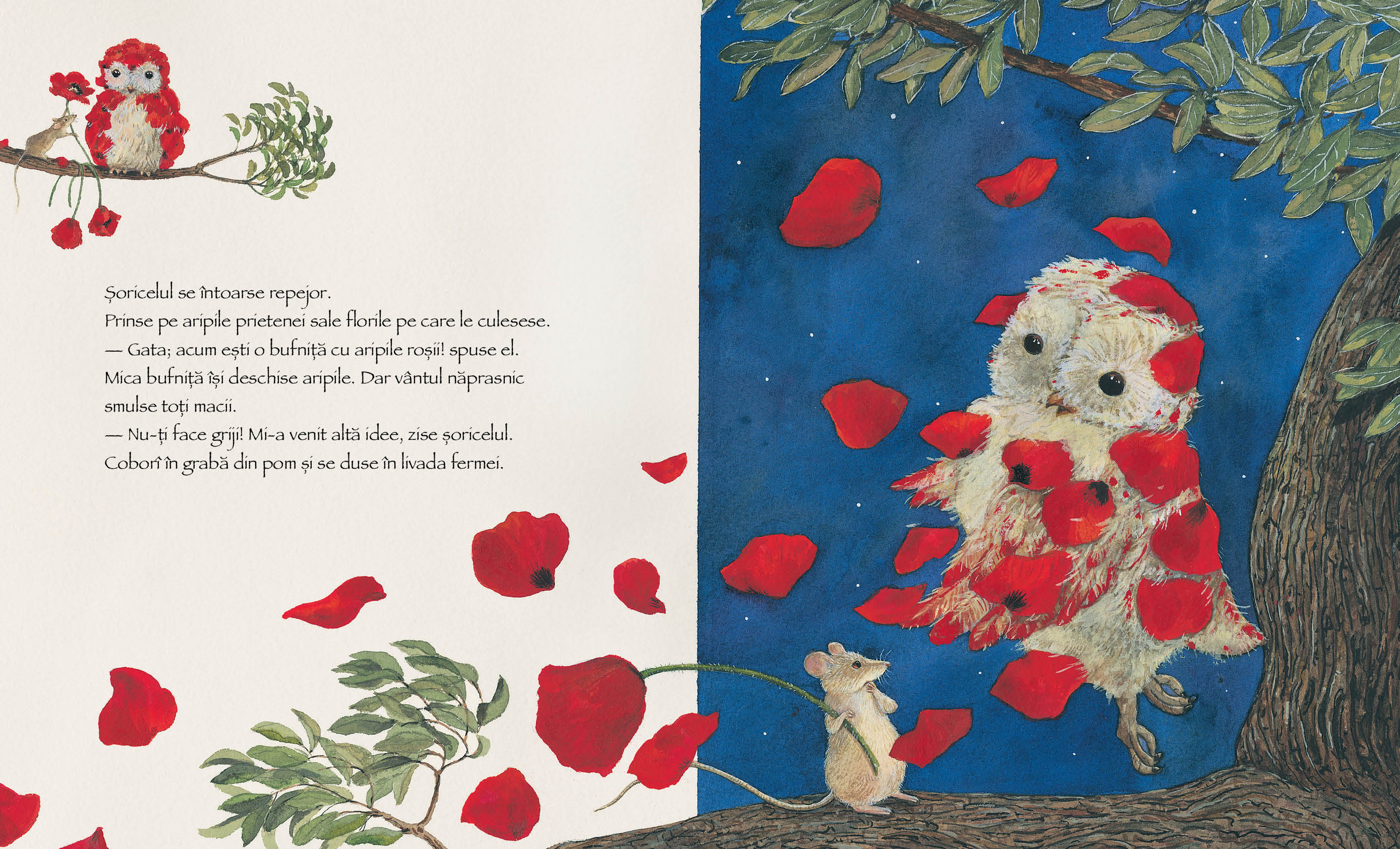 Mica bufniță este tristă, fiindcă aripile ei nu sunt roșii și puternice. Măcar de-ar avea un prieten cu care să se joace! Într-o noapte cu vânt, aude un pocnet și vede un șoricel… O poveste emoționantă despre puterea prieteniei dintre o bufniță și un șoricel.